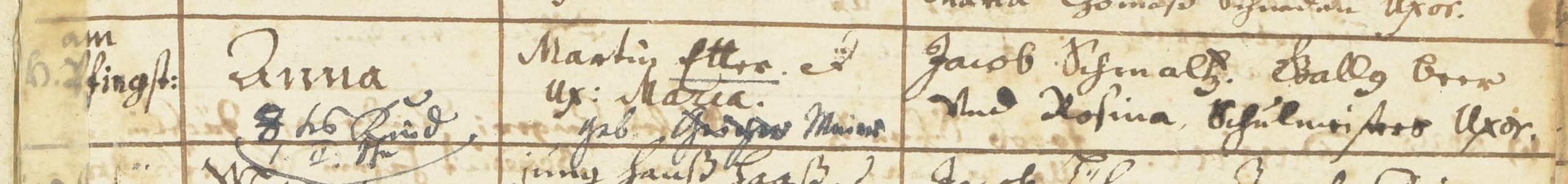 Martin Etter, Bauernpfleger (Vogt) und Witwer, heiratet am 14. Februar 1682 in Flözlingen Maria, die Tochter von Hanß Geörg Mayer, Weber in Mönchweiler.[10] Dass Martin Etters zweite Ehefrau den gleichen Vornamen trug, wie seine erste, erklärt den im Taufeintrag von 1683 und in fünf weiteren [11] zuerst falsch eingetragenen und anschließend korrigierten Nachnamen.
