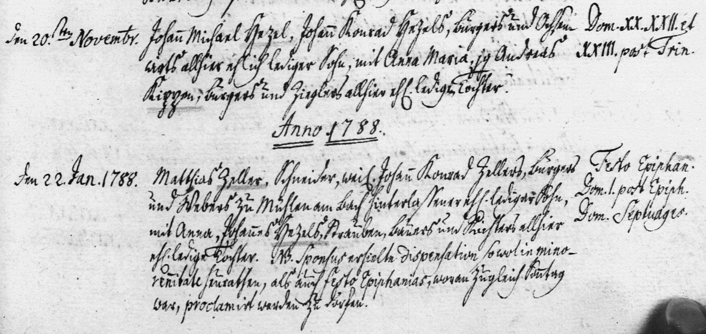 Auch im Eheregister taucht die mysteriöse Namensergänzung bei manchen „Hezel-Einträgen“ auf, bei andern wiederum nicht. Z.B. heiratete am 20. November 1787 ein „Johann Michael Hezel, Johann Konrad Hezels, Bürgers und Ochsenwirts allhier ehlich lediger Sohn“, im nächsten Eintrag vom 22. Januar 1788 ist die Hochzeit einer „Anna, Johannes Hezels, Strauben, Bauers und Richters allhier eh[lich] ledig Tochter“ vermerkt.[4]