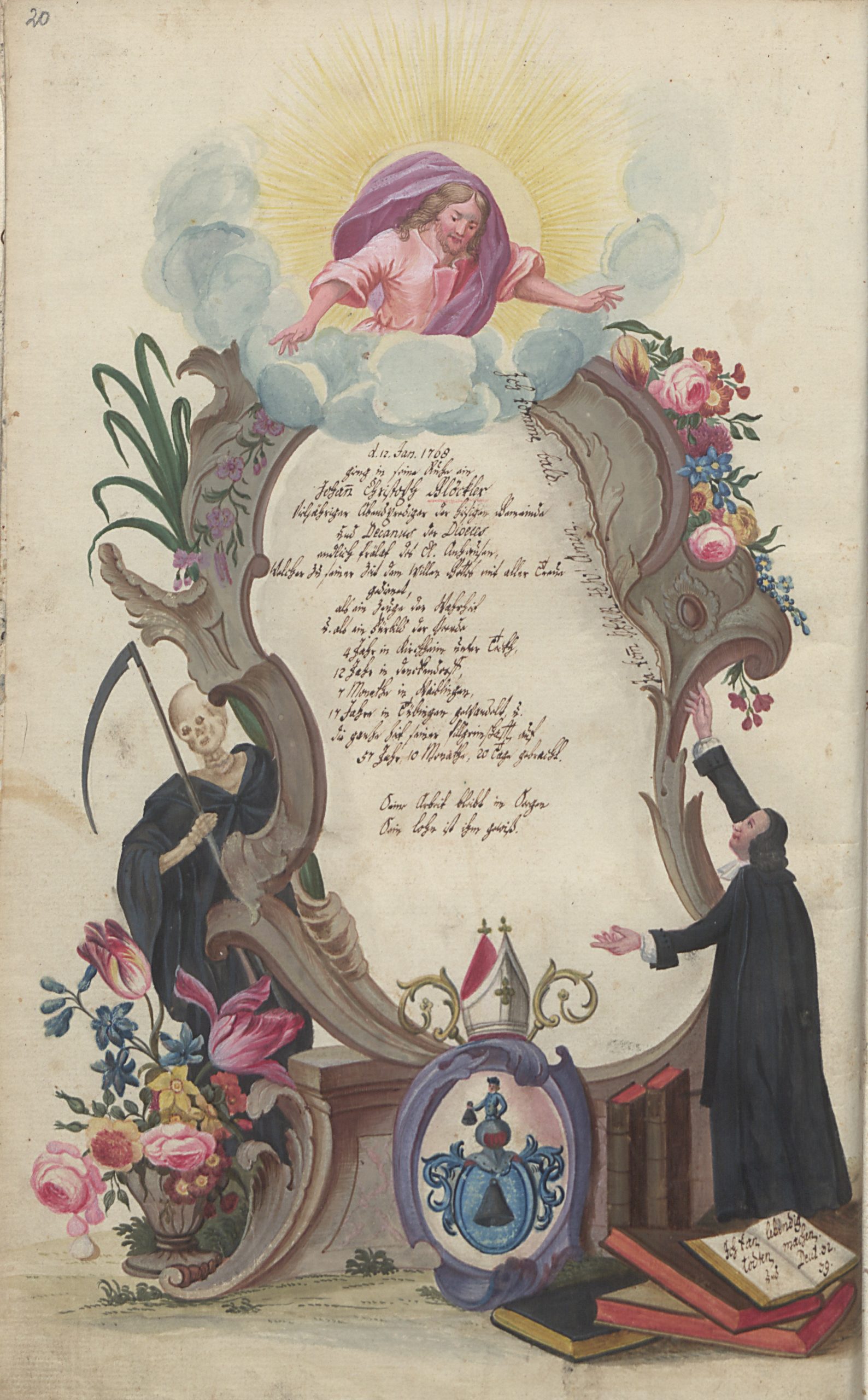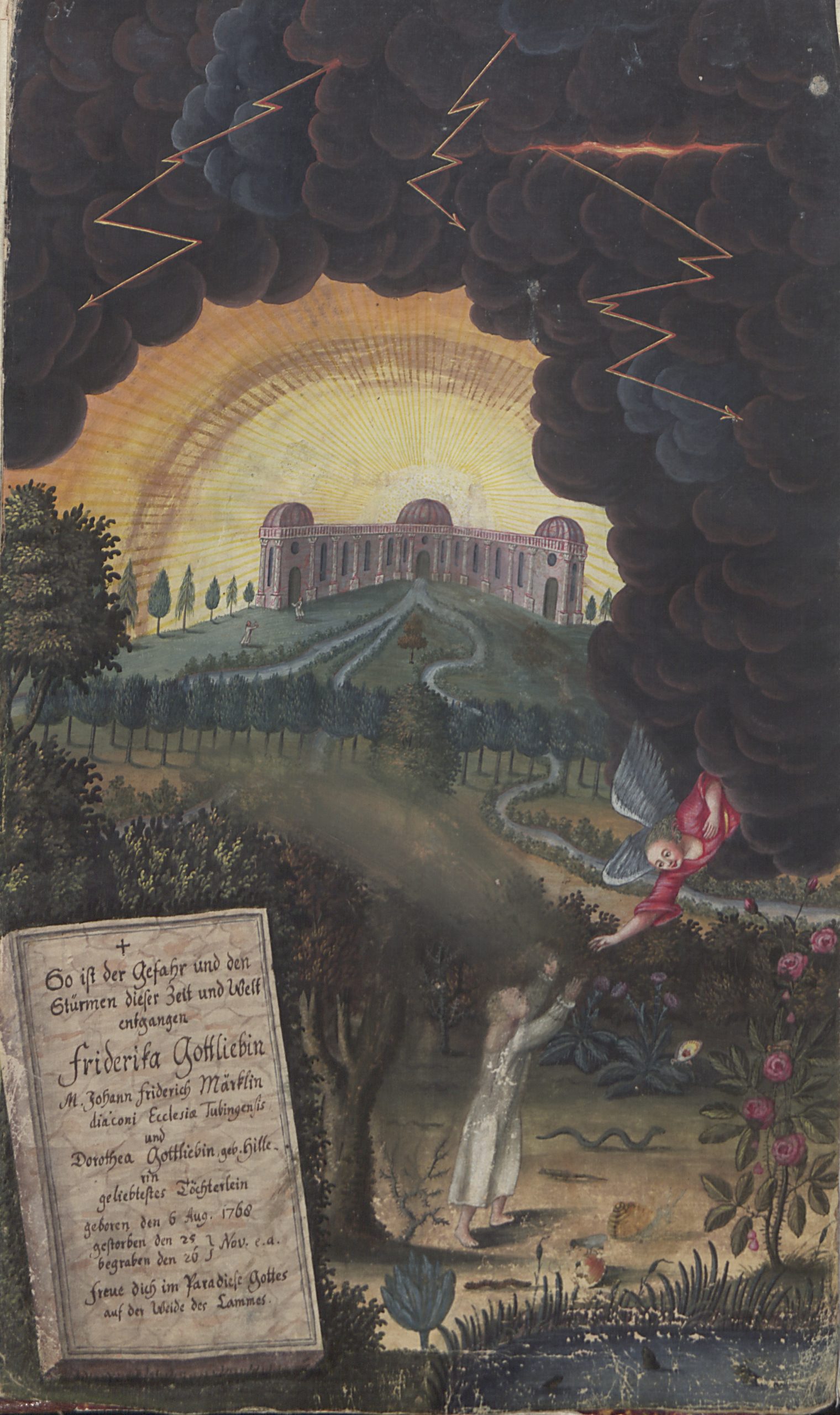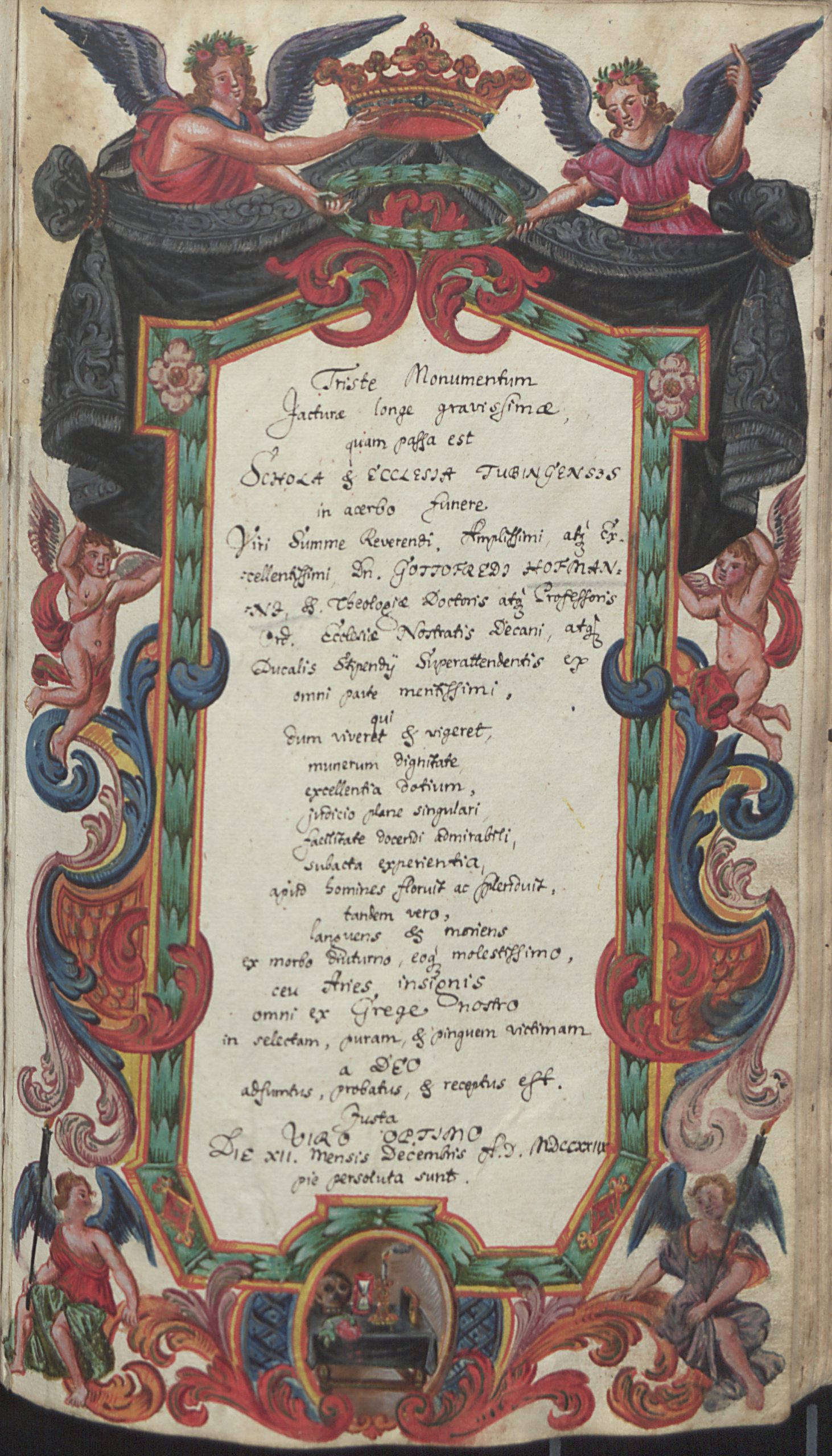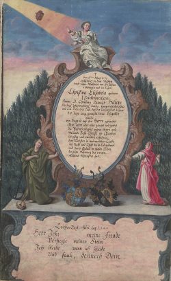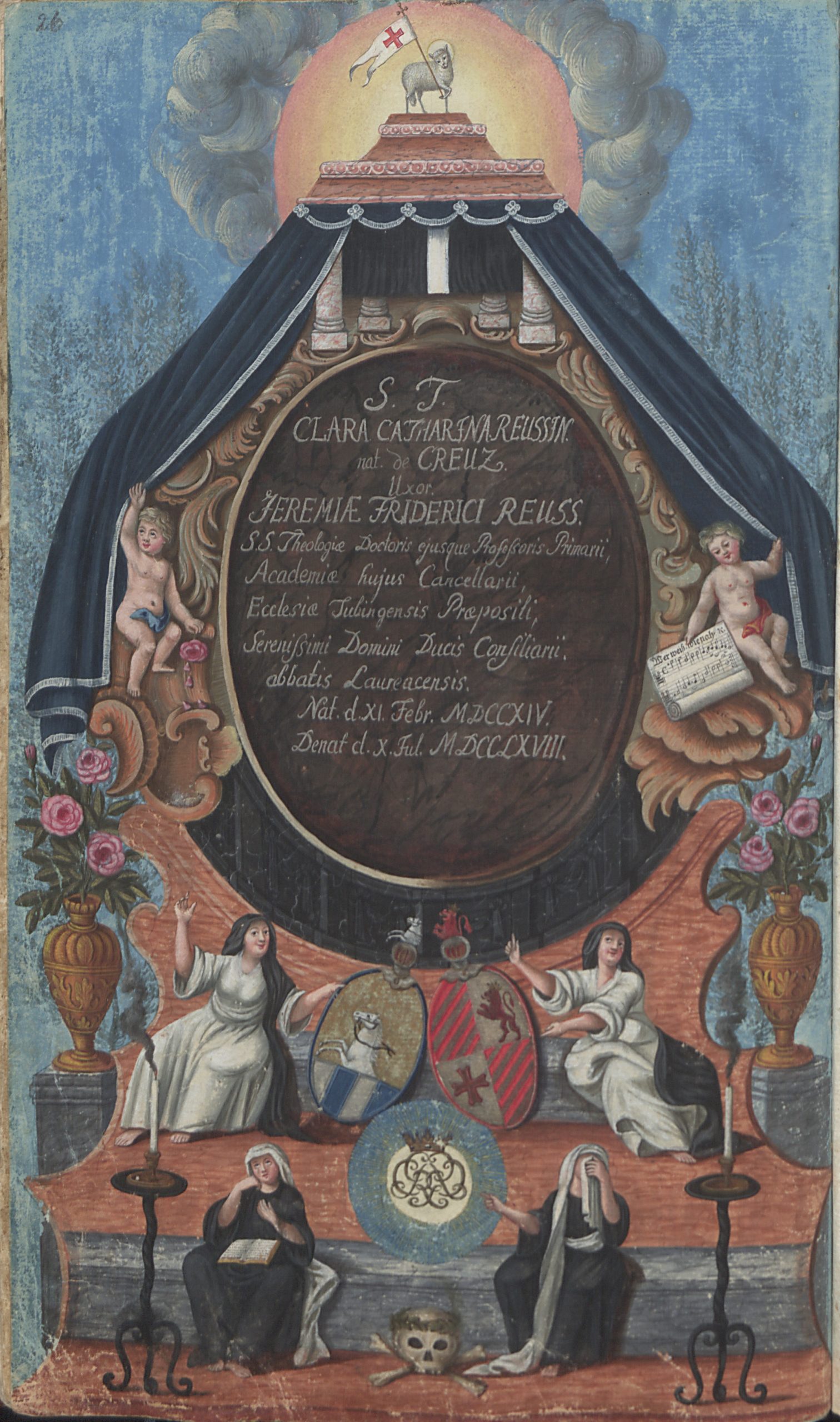 Beim Durchblättern der Tübinger Totenbücher fällt dem Betrachter eine Besonderheit auf: Es finden sich dort im Zeitraum zwischen 1692 und 1796 inmitten der anderen, schmucklosen Eintragungen insgesamt 75 handgemalte und oft reich verzierte Gedenkblätter für Verstorbene. 57 dieser besonderen Kirchenbucheintragungen sind ganzseitige Bilder, die in die betreffenden Bände eingeklebt wurden, die restlichen gemalten Sterberegistereinträge wurden direkt auf die Seiten des Kirchenbuchs zwischen den anderen Eintragungen aufgemalt. 36 Männer, zehn Frauen und 29 Kinder erhielten solche prächtig ausgestaltete Gedächtnisdarstellungen. In der Regel handelt es sich dabei um Theologen der Universität Tübingen oder Angehörige von solchen, oder aber um andere Universitätsangehörige. Die ersten Eintragungen wurden von den künstlerisch vorgebildeten Mesnern Andreas Herzog und seinem Sohn Johann Michael Herzog gestaltet. Die späteren Bilder stammen von Berufsmalern wie Jakob Daniel Schreiber, Joseph Franz Malcote, August Friedrich Oelenheinz und Jakob Friedrich Doerr.