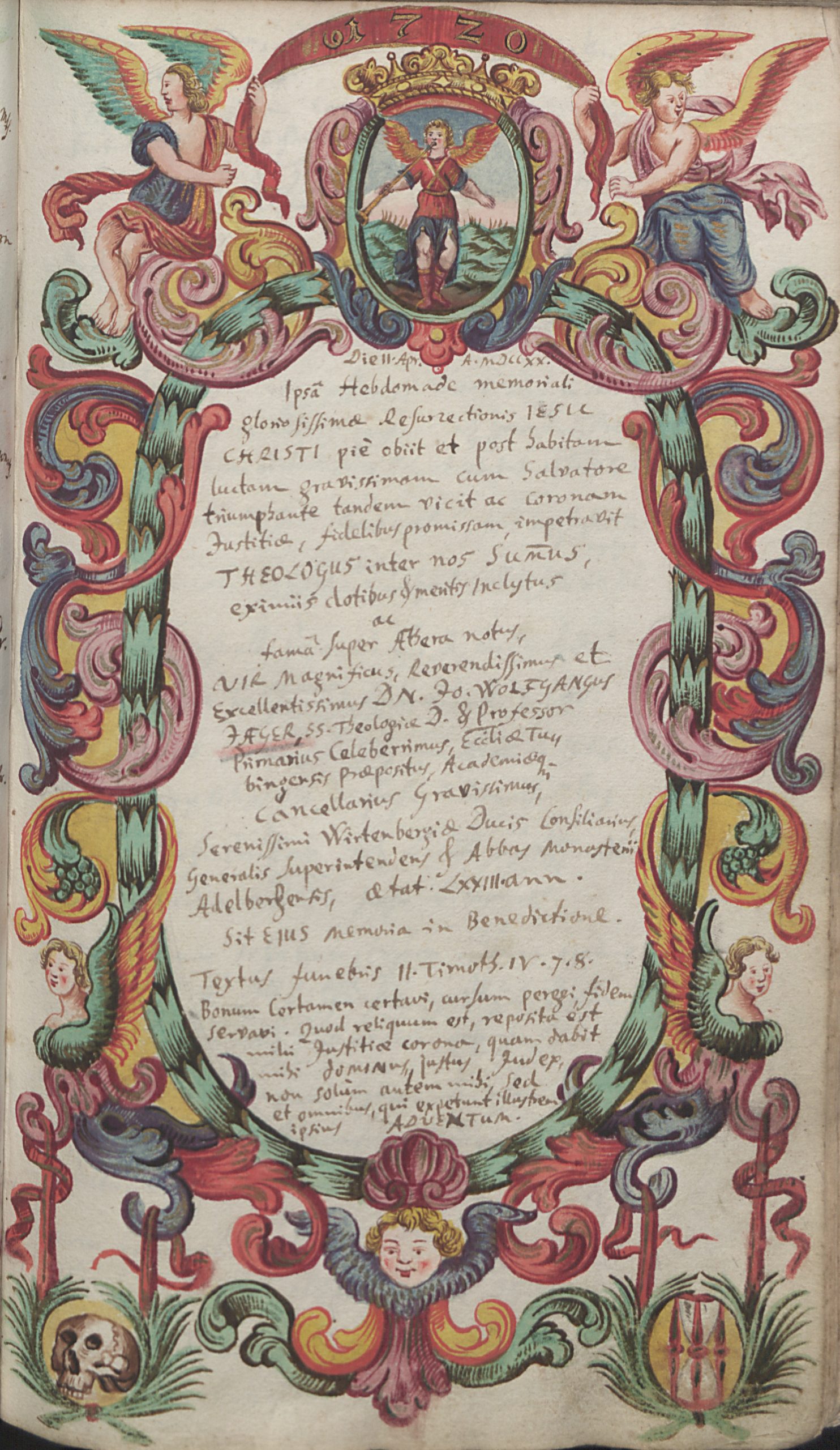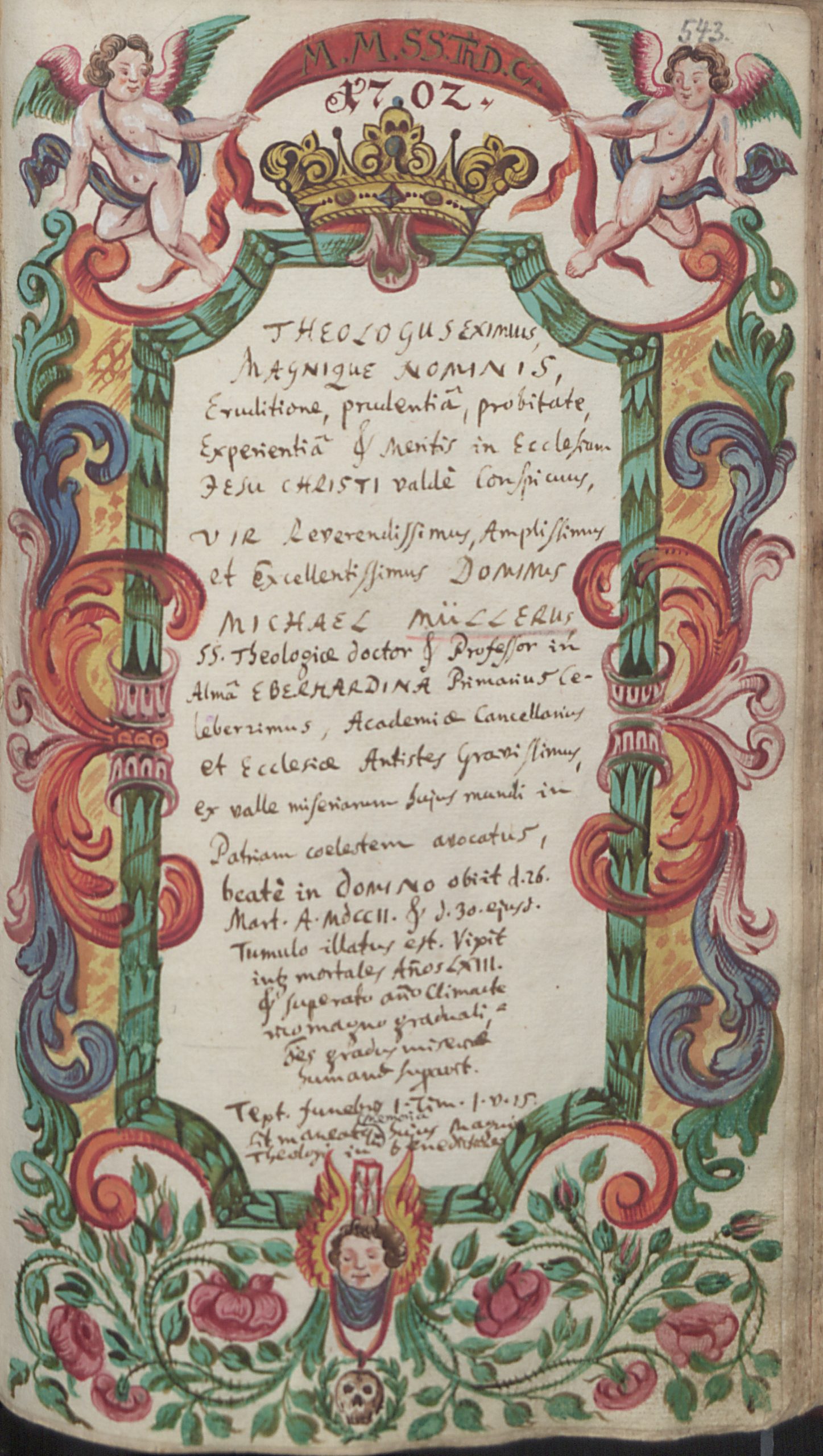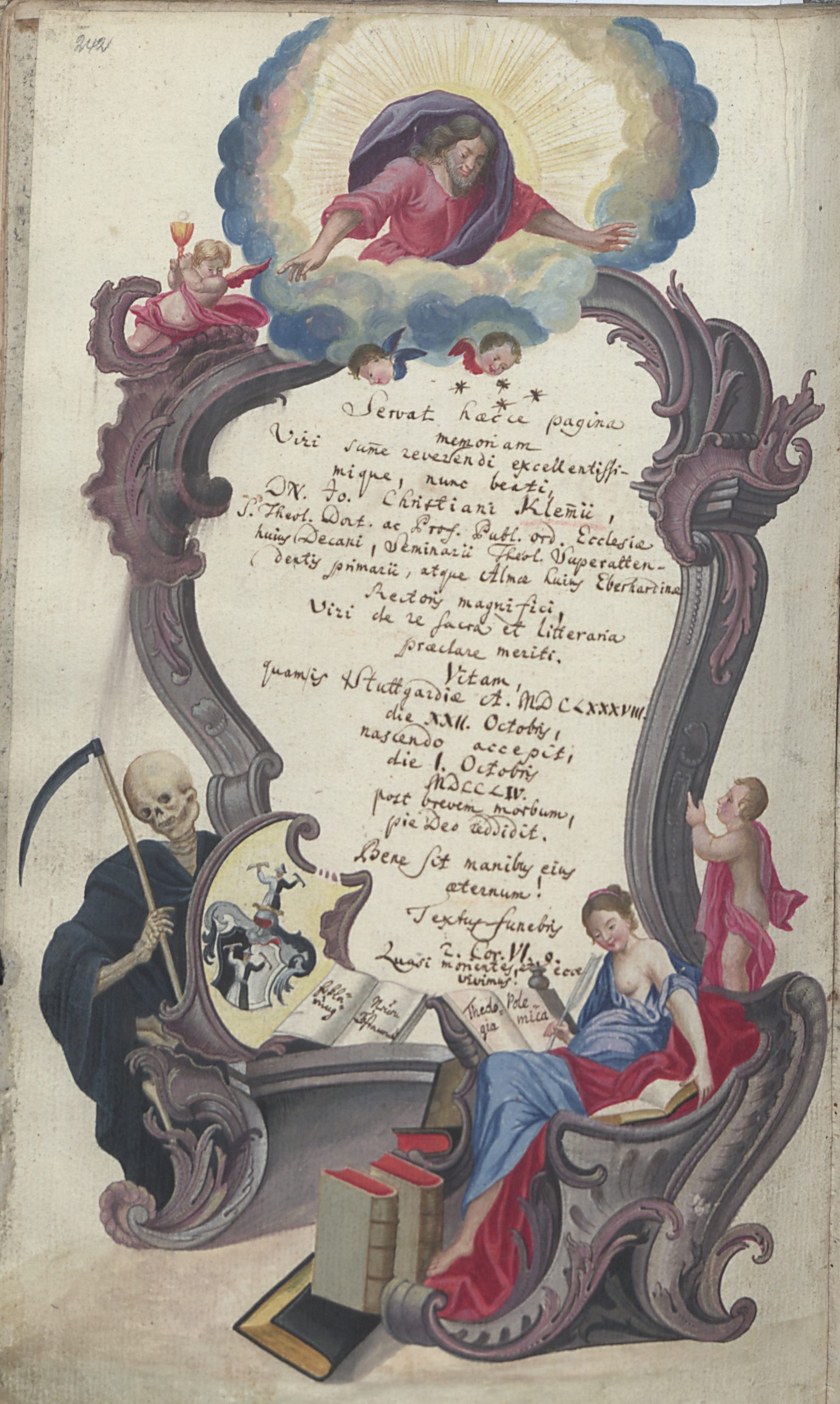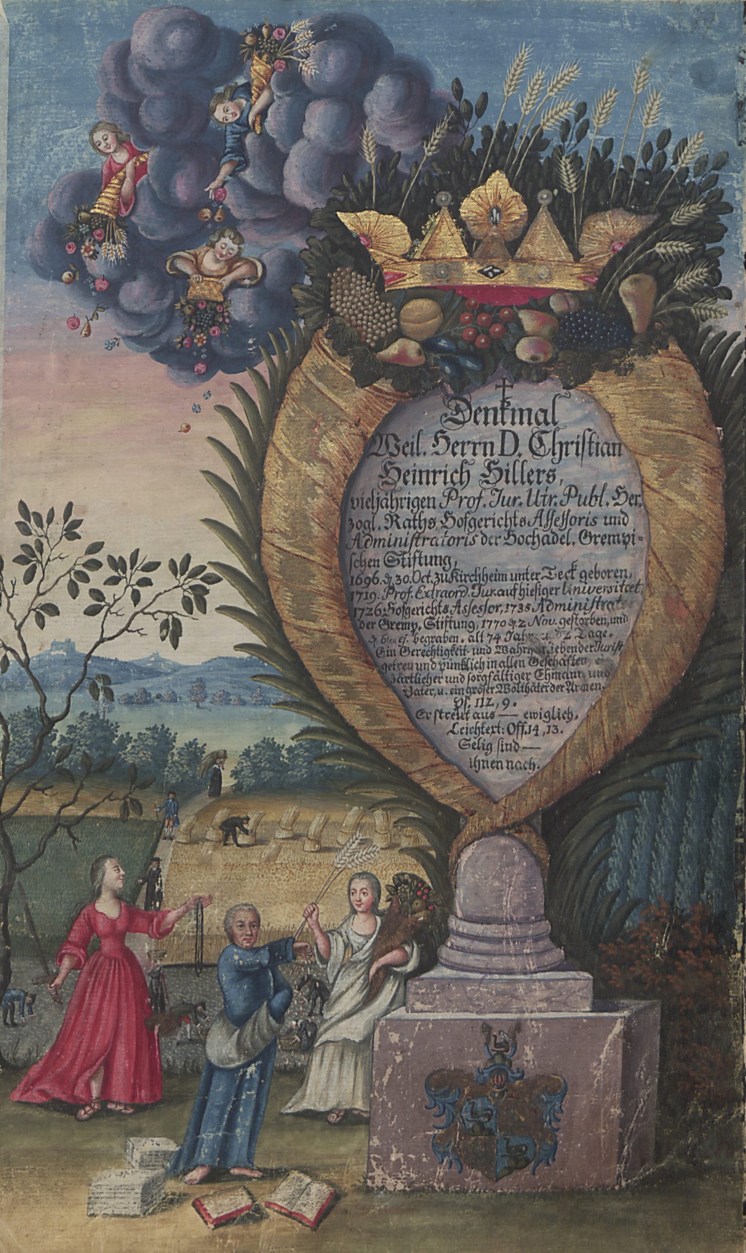 Beim Durchblättern der Tübinger Totenbücher fällt dem Betrachter eine Besonderheit auf: Es finden sich dort im Zeitraum zwischen 1692 und 1796 inmitten der anderen, schmucklosen Eintragungen insgesamt 75 handgemalte und oft reich verzierte Gedenkblätter für Verstorbene. 57 dieser besonderen Kirchenbucheintragungen sind ganzseitige Bilder, die in die betreffenden Bände eingeklebt wurden, die restlichen gemalten Sterberegistereinträge wurden direkt auf die Seiten des Kirchenbuchs zwischen den anderen Eintragungen aufgemalt. 36 Männer, zehn Frauen und 29 Kinder erhielten solche prächtig ausgestaltete Gedächtnisdarstellungen. In der Regel handelt es sich dabei um Theologen der Universität Tübingen oder Angehörige von solchen, oder aber um andere Universitätsangehörige. Die ersten Eintragungen wurden von den künstlerisch vorgebildeten Mesnern Andreas Herzog und seinem Sohn Johann Michael Herzog gestaltet. Die späteren Bilder stammen von Berufsmalern wie Jakob Daniel Schreiber, Joseph Franz Malcote, August Friedrich Oelenheinz und Jakob Friedrich Doerr.