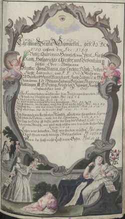 Bis zur Mitte des 18. Jahrhunderts enthalten die Darstellungen fast nur allegorische Darstellungen und Ornamentik. Danach wurden Abbildungen der Personen üblich, die entweder als Ganzkörperdarstellungen in die Bildszenen eingefügt wurden oder als Porträts erscheinen. Die Malereien beinhalten fast immer ornamentale Ausschmückungen und allegorische Darstellungen. Als Sinnbilder des Todes und der Vergänglichkeit findet man etwa Bilder menschlicher Gerippe oder Totenschädel, ablaufende Sanduhren, herunterbrennende Kerzen. Solche eher düsteren Anmutungen werden aber aufgehellt durch kindliche Engelsgestalten barocker Art sowie anmutige, manchmal sogar leicht bekleidete allegorische Frauengestalten, bunte Blüten, Landschaften und Ornamente. In die Abbildungen eingestreut, etwa auf Täfelchen in den Händen von Kindern oder Engeln, findet man auch Sinnsprüche und Hinweise auf biblische Textstellen.