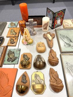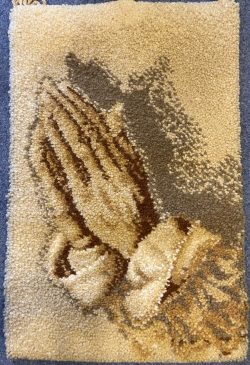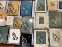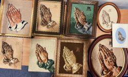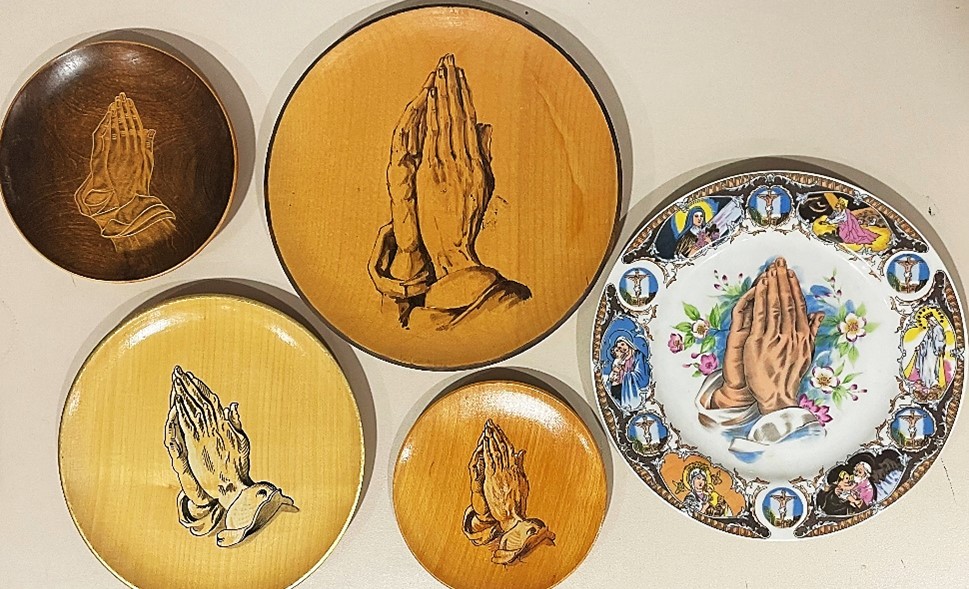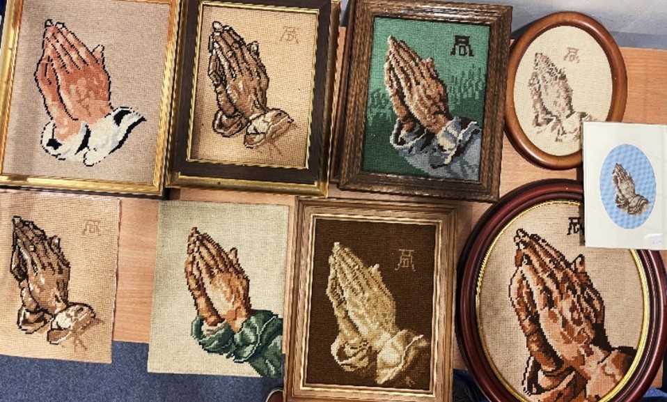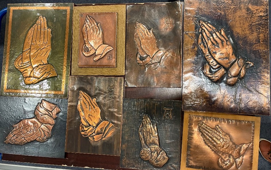 Als wir die Bilder in unserem Besprechungsraum ausgebreitet haben, fiel die schwankende Qualität der Objekte auf. Die überraschende Zahl der unterschiedlichen Materialien zeigt, dass dieses Motiv in der Vergangenheit wohl sehr beliebt war. Bei diesen Bildern kommt es nicht auf das Einzelne an. Viele erscheinen uns heute kitschig und schlecht gemacht. Wichtig ist die große Menge der Bildnisse. Sie zeigt, dass die „Betenden Hände“ vielen Menschen etwas bedeutet haben.