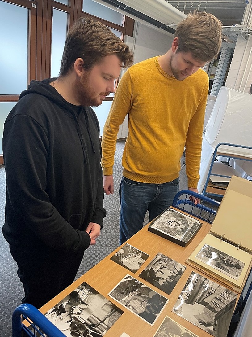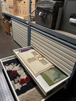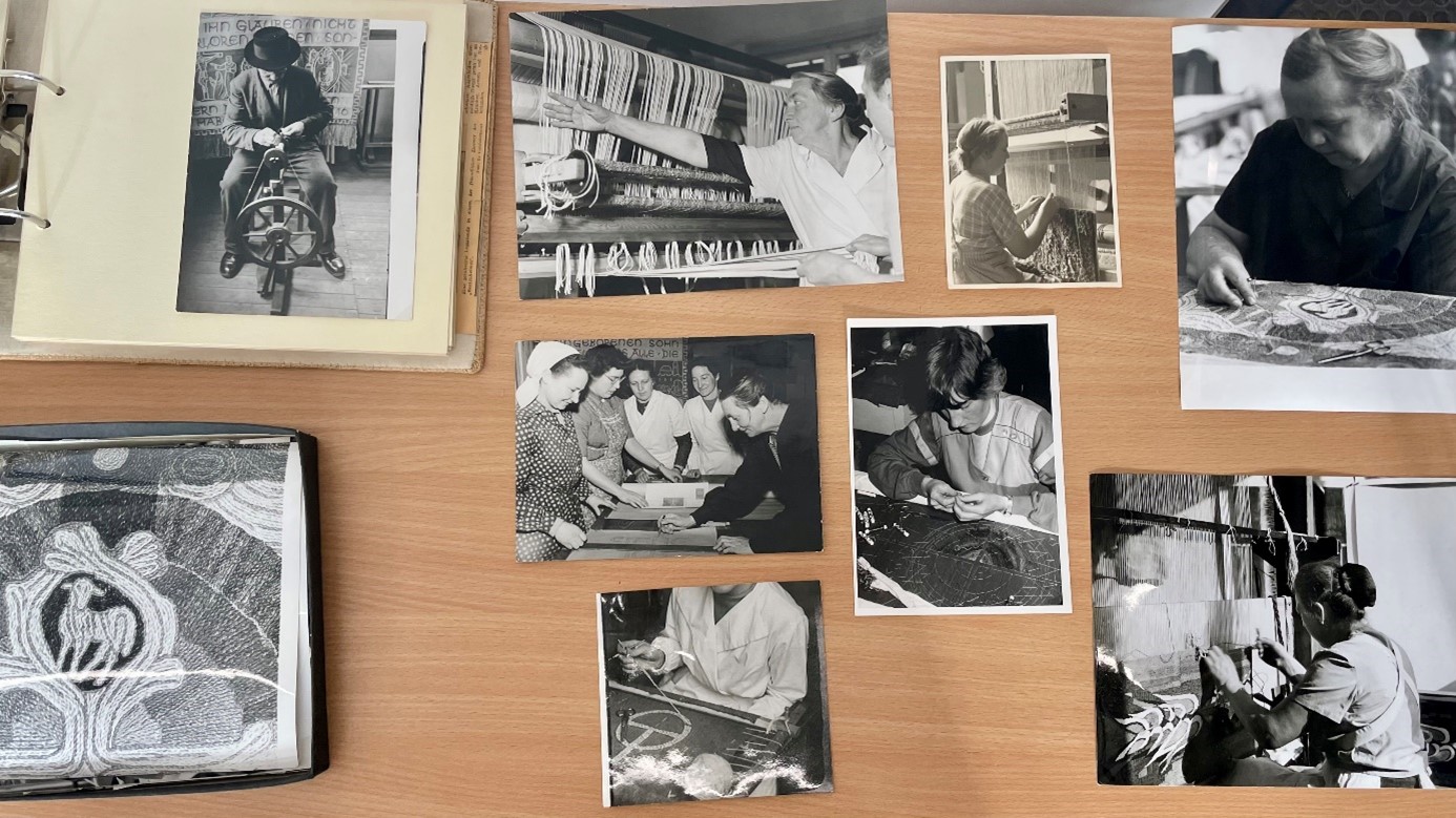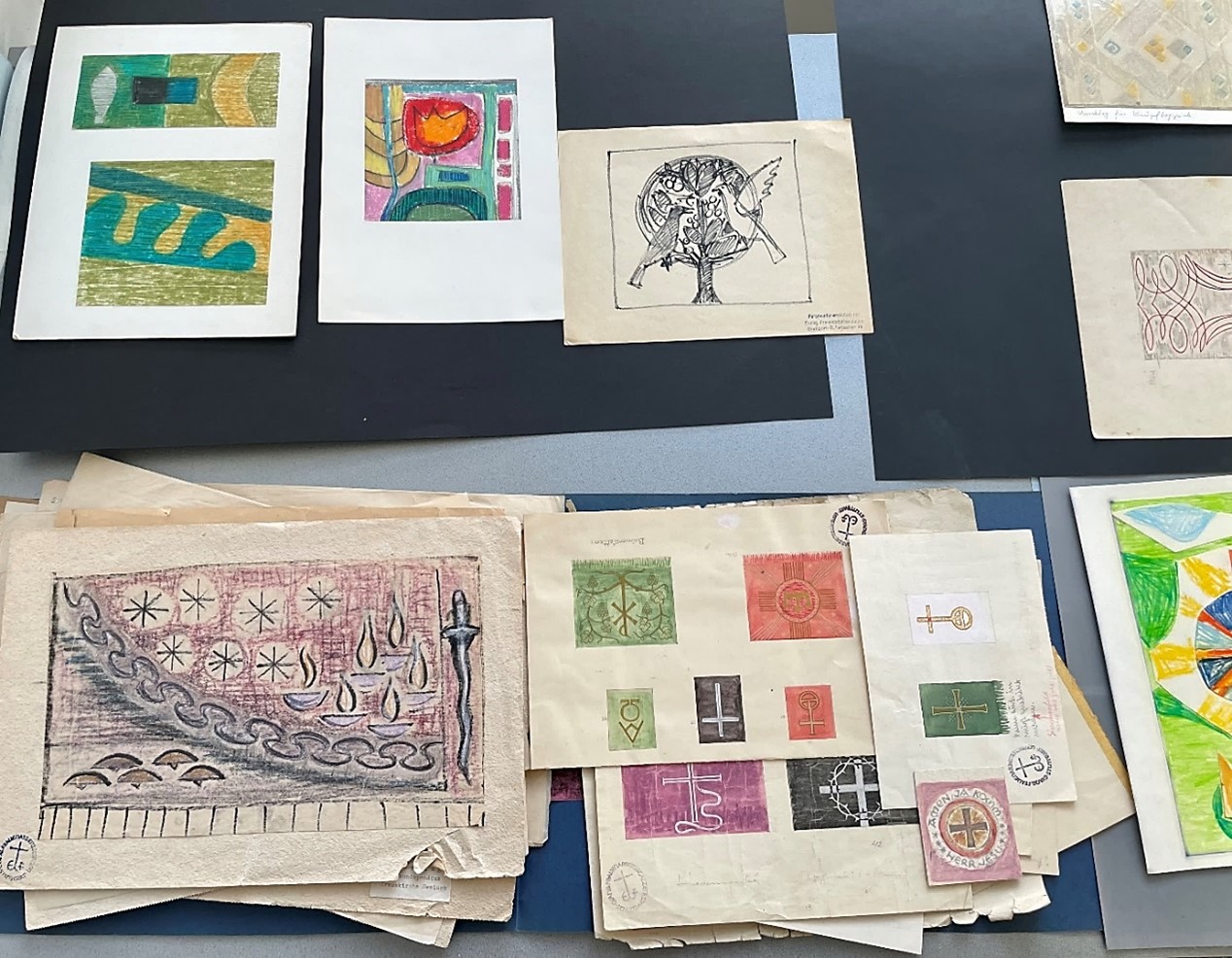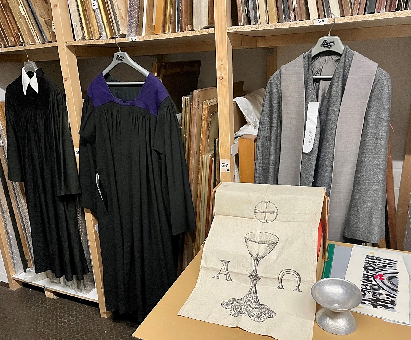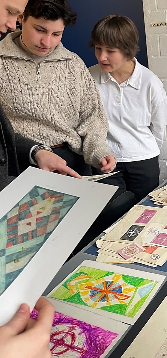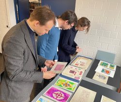 Nachdem die Studierenden sich mit den biblischen Grundlagen und historischen Entwicklungen beschäftigt hatten, führte sie eine Exkursion zu uns ins Landeskirchliche Archiv Stuttgart. Sie erhielten Einblick in den Archivbestand der Evangelischen Paramentenwerkstatt, die von 1924 bis 1997 in Württemberg wirkte. Entwürfe und Fotografien aus dieser Zeit zeigten die gestalterischen und handwerklichen Grundlagen der textilen Werke. Anschließend ging es in das Magazin der Musealen Sammlung, wo Paramente aus verschiedenen Epochen und Stilrichtungen entdeckt werden konnten. Besondere Stücke waren selbstgebastelte Altartücher, die in Kriegsgefangenenlagern des Zweiten Weltkriegs von den Internierten aus Lumpen- und Teppichresten gefertigt worden waren, um auch unter schwierigen Bedingungen einen würdigen Gottesdienst feiern zu können. Großes Interesse bestand ebenso an der liturgischen Kleidung. Die Museale Sammlung beherbergt nicht nur Standardversionen von Talar und Beffchen, sondern auch individuell gestaltete Exemplare aus den 1980er Jahren, die versuchten, den traditionell gesteckten Rahmen zu sprengen, um etwa mehr Nähe zu Alltag und Gemeinde herzustellen. Vorgestellt wurde auch der Talar einer der ersten Pfarrerinnen in Württemberg und dem dazugehörigen „Frauenbeffchen“, das einem Blusenkragen nachempfunden war.