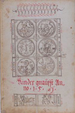 Auf der zweiten Seite [2], dem Beginn der Taufeinträge des Jahres 1561, sind Szenen aus der Bibel dargestellt. In der obigen Tafel sind es: