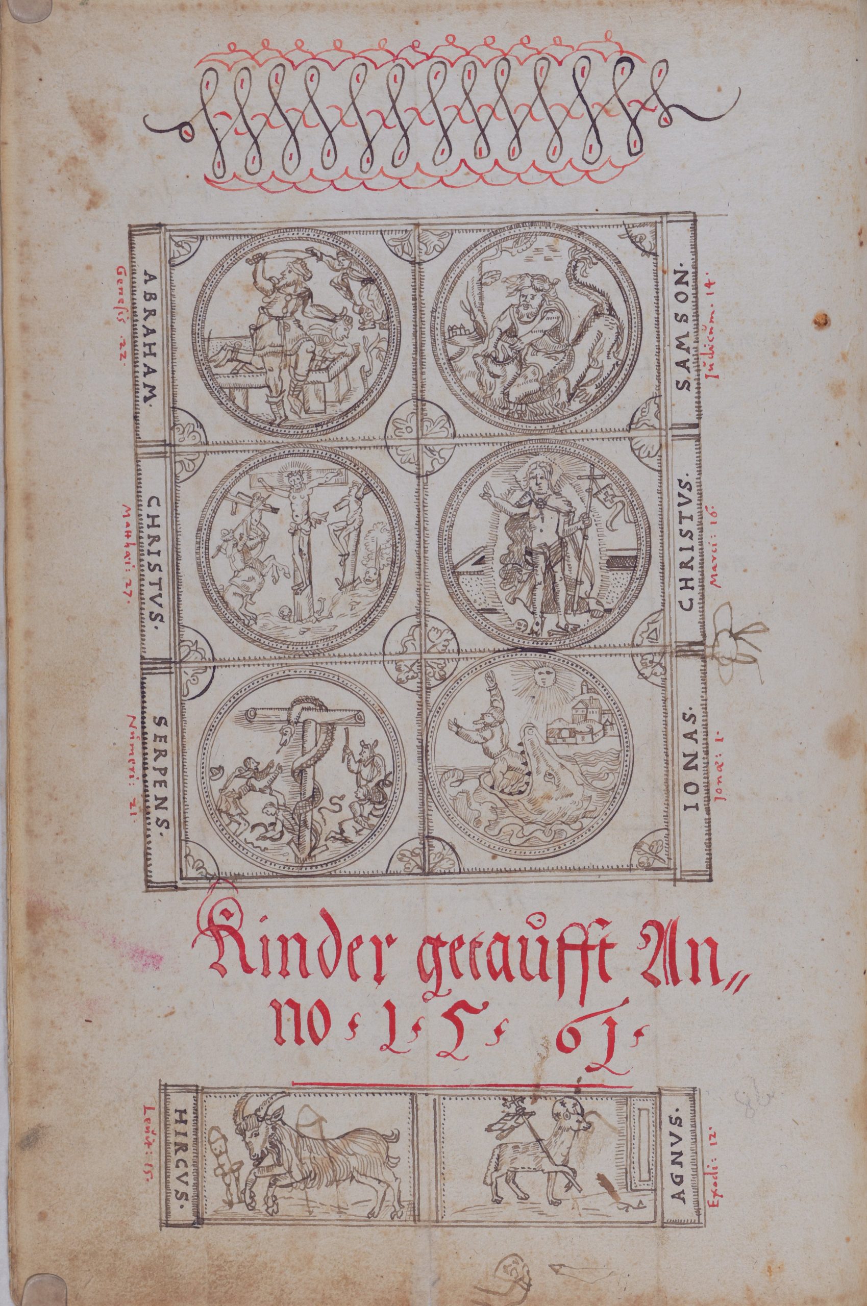 - Auch hier passt das Bild nicht zur angegebenen Bibelstelle. Der Ziegenbock (Hircus) wird erst in Levitikus 16,22 (= 3. Buch Mose 16,22) erwähnt: „und der Bock soll alle ihre Sünden mit sich in die Einöde tragen“. Was die beiden wahrscheinlich nachträglich von einer anderen Person eingefügten Symbole auf bzw. neben dem Ziegenbock darstellen, ist unklar. In Levitikus 15 (= 3. Buch Mose 15 ) geht es um Ausflüsse aus den Genitalien, weshalb ein Phallus-Symbol nicht ausgeschlossen ist.
