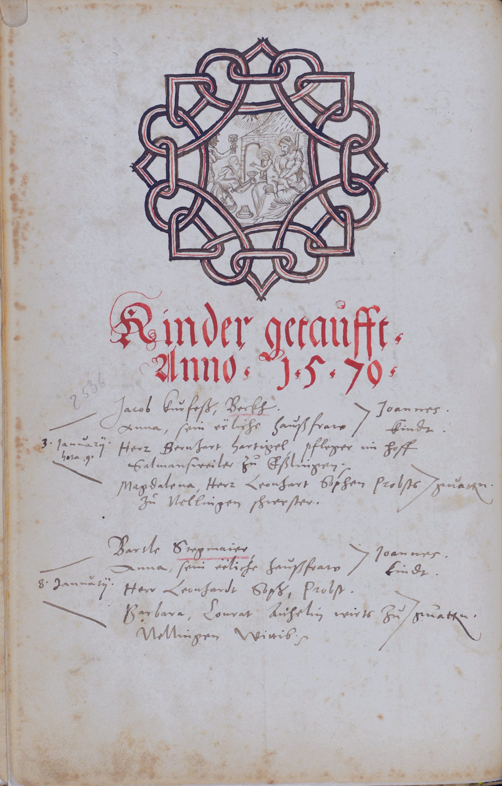 Auf der sechsten Seite [6], der ersten Seite mit den Taufeinträgen von 1570, ist im gleichen Ornament wie auf der fünfen Seite die Anbetung des Jesuskindes durch die Sterndeuter aus dem Osten dargestellt (Matthäus 2,10-11). In der christlichen Kunst wird dieses Motiv mit „Anbetung des Jesuskindes durch die Heiligen Drei Könige“ oder kurz „Anbetung der Könige“ betitelt. In dem Bild sind nur zwei Sterndeuter dargestellt, wovon einer eine dunkle Hautfarbe hat. In der Bibel wird weder die Anzahl noch die Hautfarbe oder Namen der Sterndeuter genannt. Die Zahl drei, die Namen Caspar, Melchior und Balthasar, in machen Darstellungen auch die dunkle Hautfarbe des letzteren, hat sich erst über die Jahrhunderte entwickelt. Hier: Beispiele für die Darstellung