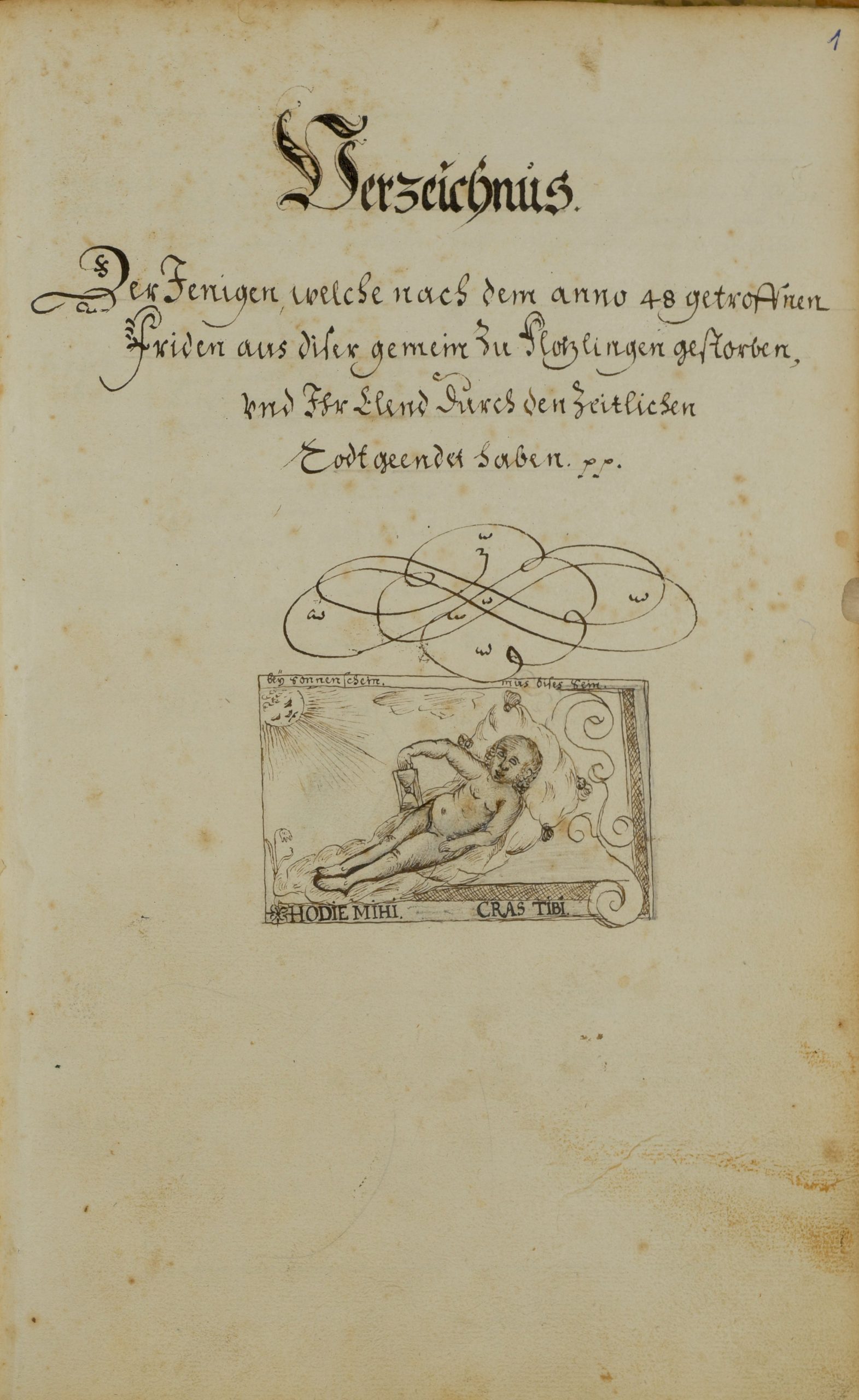 Dem 1650 beginnenden Totenregister ist das Bild einer schlafenden Person (eines Kindes?) vorangestellt. Die Person hält eine Sanduhr, ein Symbol für die Vergänglichkeit. Im oberen Bildrand steht „Bey Sonnenschein, mus dises Sein.“, im unteren „HODIE MIHI. CRAS TIBI“, also „heute mir, morgen dir“. Letzterer Spruch ist auf vielen Epitaphien u.ä. zu finden.