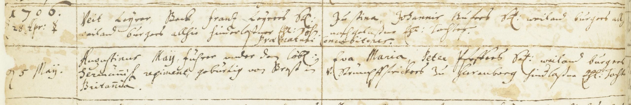 Die Auflösung ist schließlich im Eheeintrag vom 5. Mai 1706 in Gültstein zu finden. Dort ist als Geburtsort des Augustinus Mays, hier im Rang bzw. mit der Aufgabe eines Führers, „Brest in Britannia“ angeben,[3] was als Brest im Département Finistère in der Bretagne identifiziert werden kann.