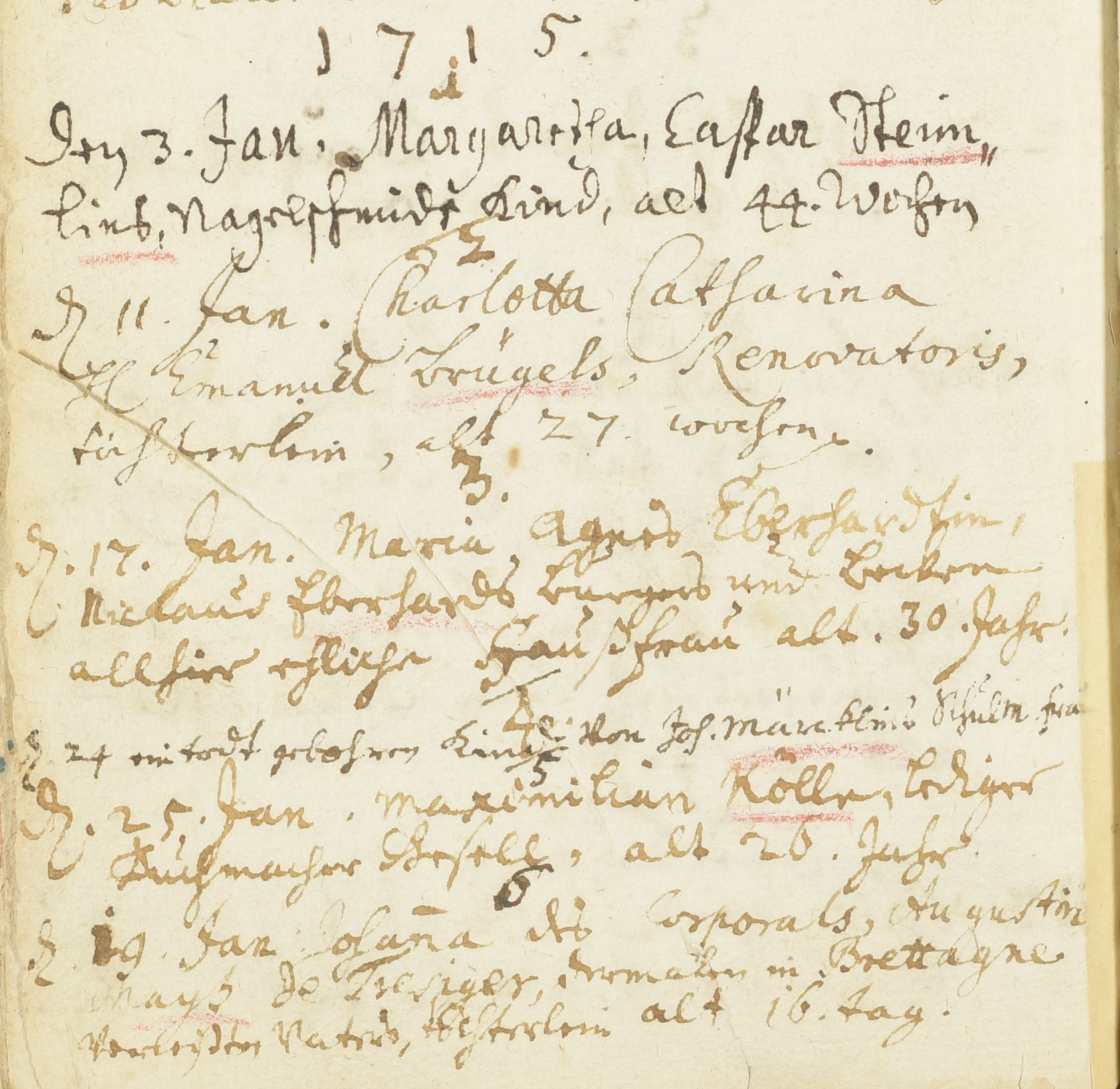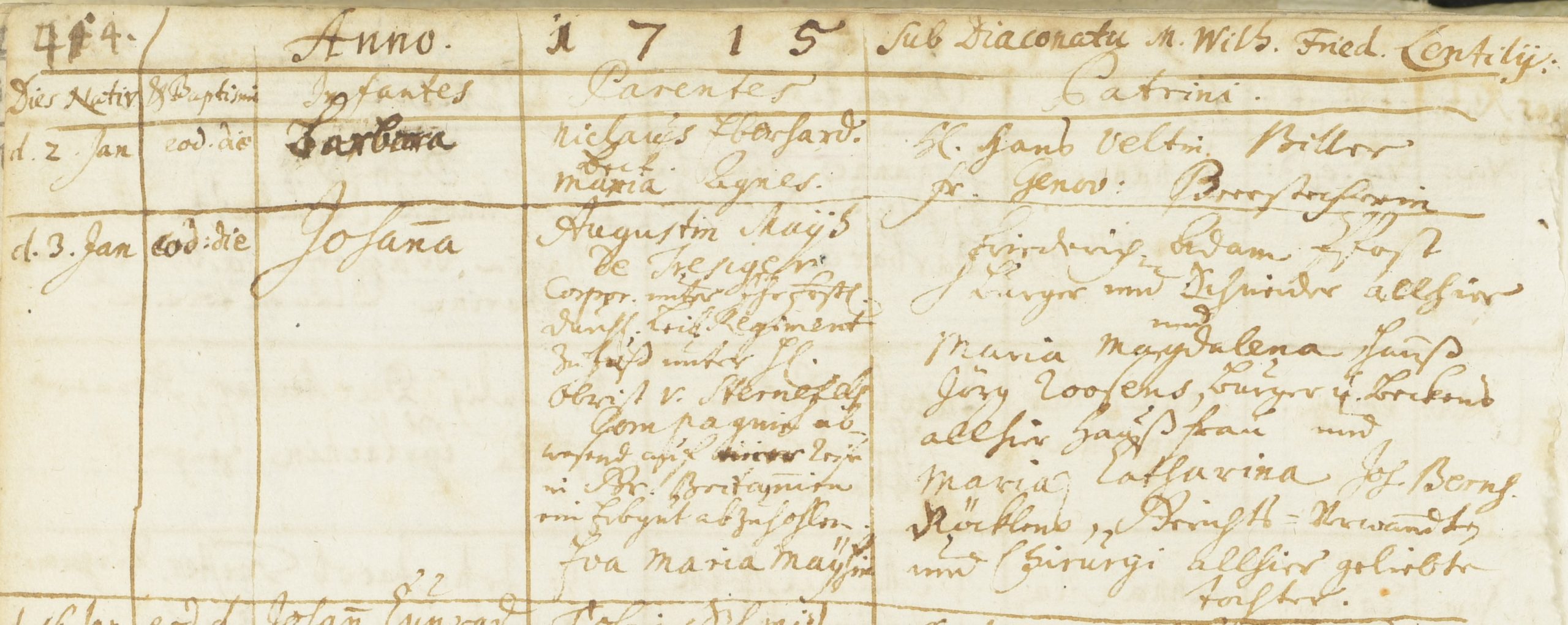 Am 3. Januar 1715 wurde in Herrenberg das Mädchen Johanna, Tochter des Korporals Augustin Mayh de Tresiger und dessen Ehefrau Eva Maria, geboren und noch am gleichen Tag getauft.[1] Das Mädchen starb leider bereits etwas mehr als zwei Wochen später und wurde am 19. Januar in Herrenberg begraben (unterster Eintrag im Bild).[2]