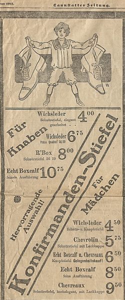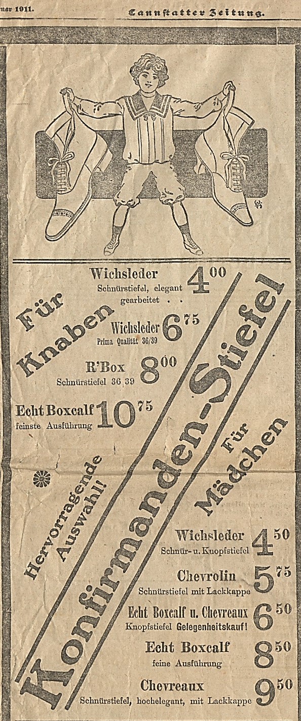 Die Konfirmation war lange Zeit eine wichtige Zäsur im Leben der Heranwachsenden. Mit der Konfirmation war auch die Schulpflicht zu Ende, und für die meisten begann der Start in die Lehre, in den Beruf, der erste Schritt ins Erwachsenenleben. Deshalb bekamen die Konfirmandinnen und Konfirmanden erstmals Erwachsenenkleidung, meist etwas größer, zum Hineinwachsen. Auf älteren Konfirmations-Fotos sehen die Jugendlichen mit ihren 14 Jahren daher merkwürdig alt aus: Die Jungs mit Anzügen und Hüten, die Mädchen mit schwarzen hochgeschlossenen Kleidern. Die in der Zeitungsanzeige von 1911 angebotenen Konfirmanden-Stiefel scheinen jedoch nichts für die Durchschnittsjugendlichen gewesen zu sein, in edlen Ledervarianten und feiner Ausführung waren sie zu teuer und unpraktisch für die meisten.