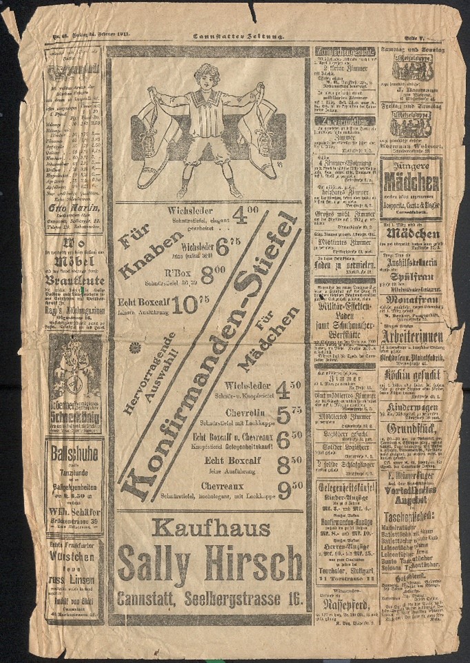 Doch jedes Ding erzählt nicht nur eine Geschichte. Die Annonce war platziert worden vom Kaufhaus Sally Hirsch in Cannstatt, Seelbergstraße 16. Der Vorname weckte unser Interesse und führte zu weiteren Recherchen. Ist Sally der Name einer Frau? Oder ist er die Abkürzung von Salomo, wie es bei deutsch- und jiddischprachigen Juden früher üblich war? Was ist aus dem Kaufhaus und ihren Inhabern geworden? Auf der Internetseite der Stuttgarter Stolperstein-Initiative wurden wir fündig. Rainer Redies beschreibt dort den Werdegang und das Schicksal der Kaufmannsfamilie.