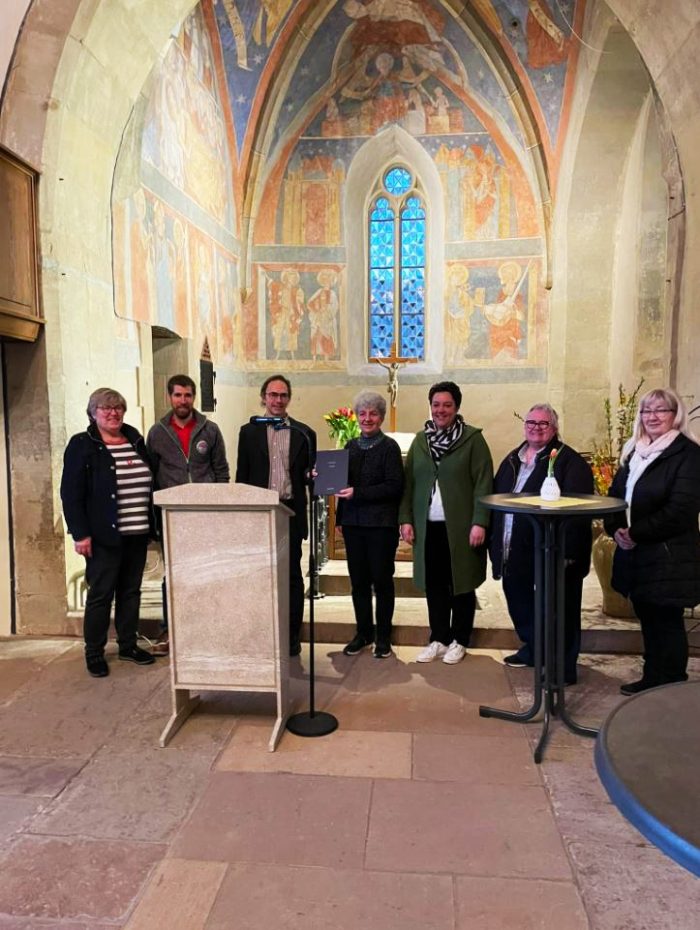 Am 21. April lud die Evangelische Kirchengemeinde Schützingen zu einem Findbuchabend in die Ulrichskirche ein. Auf Anregung der Kirchengemeinde war das Pfarrarchiv verzeichnet worden. Für die Erschließung konnte die Doktorandin Regina Fürsich, Mitarbeiterin am Historischen Institut, Abteilung Landesgeschichte der Universität Stuttgart gewonnen werden. Mitglieder der Kirchengemeinde unterstützten die Finanzierung des Projektes. Die Erschließung des Pfarrarchivs sollte ein bleibender Beitrag für das Ortsjubiläum sein, feiert Schützingen doch im Jahr 2023 das 1000-Jahrfest seiner urkundlichen Ersterwähnung (1023) mit einem vielfältigen Programm. Der Findbuchabend in der mit wunderschönen, farbigen mittelalterlichen Fresken bemalten Ulrichskirche fand im Rahmen dieses Festprogrammes statt. Die einzelnen Programmpunkte des Abends wurden von stimmungsvoller Orgelmusik eingerahmt. Bürgermeister Armin Piocha würdigte in seiner Ansprache das Findbuchprojekt der Kirchengemeinde. Vom Landeskirchlichen Archiv stellte der Sprengelarchivar Dr. Andreas Butz, der die Verzeichnung redaktionell begleitet hatte, die Arbeit des Landeskirchen Archivs mit einem Kurzvortrag vor. Bei der danach erfolgten Überreichung des Findbuches an die Kirchengemeinde wurde der Kirchengemeinde für ihr Engagement gedankt und der Hoffnung Ausdruck verliehen, dass das Inventar von Interessierten eifrig genutzt werde. Regina Fürsich stellte dann in ihrem spannenden Vortrag „Die Pfarrer der Kirchengemeinde Schützingen. Anekdoten und Schlaglichter aus 1000 Jahren Geschichte“ die Aufgaben der Pfarrer im Lauf der Jahrhunderte anhand von Beispielen vor. Bei einem Stehempfang im Anschluss bot sich Gelegenheit zum anregenden Gespräch bei leckerer Bewirtung vom Frauenfrühstückkreis und mit dem Jubiläumswein, den das Weingut Zaiss für das runde Jahrtausend urkundlicher Ersterwähnung kreiert hatte.