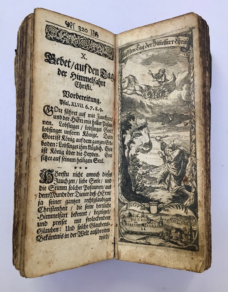 Der Kupferstich in diesem in Stuttgart herausgegebenen Gebetbuch von 1688 zeigt nicht den himmelfahrenden Christus, sondern den Propheten Elija aus dem Alten Testament. In vielen alten Darstellungen wird die Himmelfahrt des Elija als Präfiguration der Himmelfahrt Christi gezeigt: Das, was im Alten Testament angekündigt wird, vollendet sich im Neuen Testament.