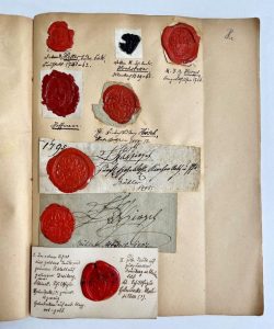 In unserem Archiv befindet sich eine Schachtel, die gefüllt ist mit einer bunten Mischung von Siegeln. Beigefügt ist ein Heft, das weitere, nach Orten sortierte eingeklebte Exemplare enthält. Eine wahre Fundgrube für Wappenforscher und einschlägige Sammler!