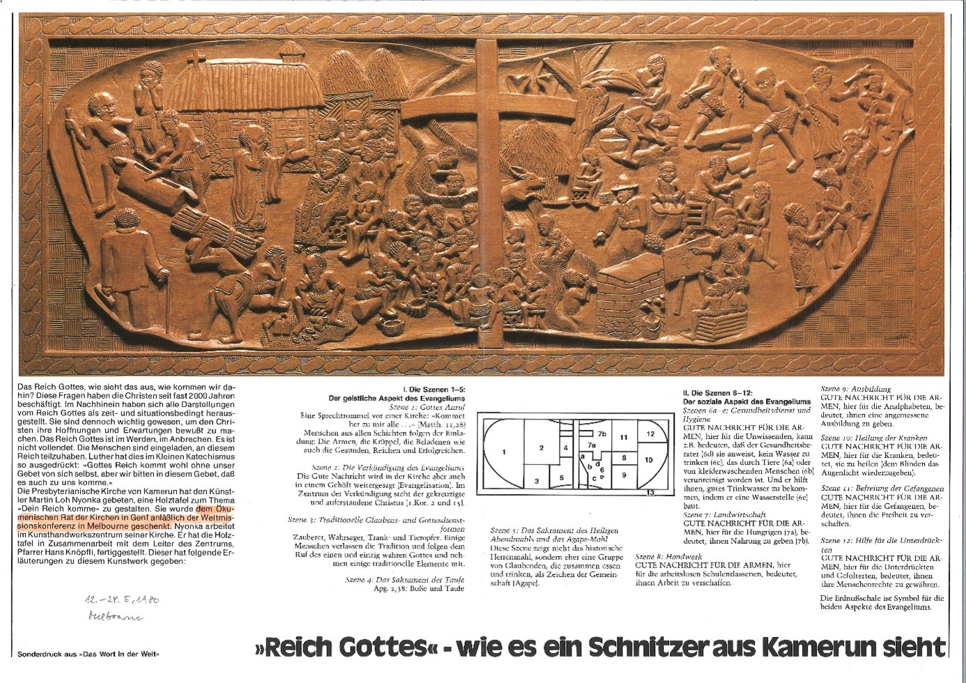 Im Vorfeld der Weltmissionskonferenz (1980) in Melbourne, Australien, schrieb der Ökumenische Rat der Kirchen 1979 seine Mitgliedskirchen an und bat um Beiträge und Reflexionen zum Konferenzmotto ‚Dein Reich komme‘, einer Bitte aus dem Vaterunser. Die Presbyterianische Kirche in Kamerun bat darauf ihre Mitglieder – Theologen und Laien – um ihre Ideen dazu. Den ersten Preis bekam der Schnitzer Martin Loh Nyonka mit dem Tafelbild „Das Reich Gottes“ in einer Erdnuss. Erklärung: Wie die Erdnuss zwei Kerne hat, besteht das Reich Gottes auch aus zwei Bereichen – der sozialen und der geistlichen Arbeit. Das Schnitzwerk wurde in Melbourne ausgestellt und ist jetzt im Besitz des Ökumenischen Rates der Kirchen in Genf. Lange hing es dort im Büro des Generalsekretärs. Da das Bild sehr großen Anklang fand, wurde es von Martin Loh Nyonka noch vier Mal nachgeschnitzt: zum einen für Papst Johannes Paul II, der sich am 12. August 1985 in Yaoundé mit Vertretern aller christlichen Kirchen in Kamerun traf, zum zweiten für Hans Knöpfli, den früheren Leiter des Kameruner Handwerkerzentrums in Bali-Nyonga, der die Arbeit von Martin Loh Nyonka begleitete, zum dritten für den späteren Landesbischof Eberhardt Renz anlässlich seines Ausscheidens als Afrikareferent der Basler Mission.