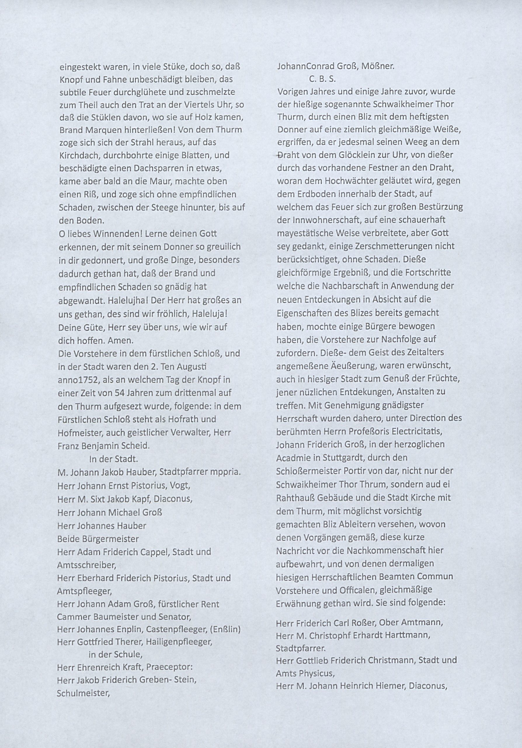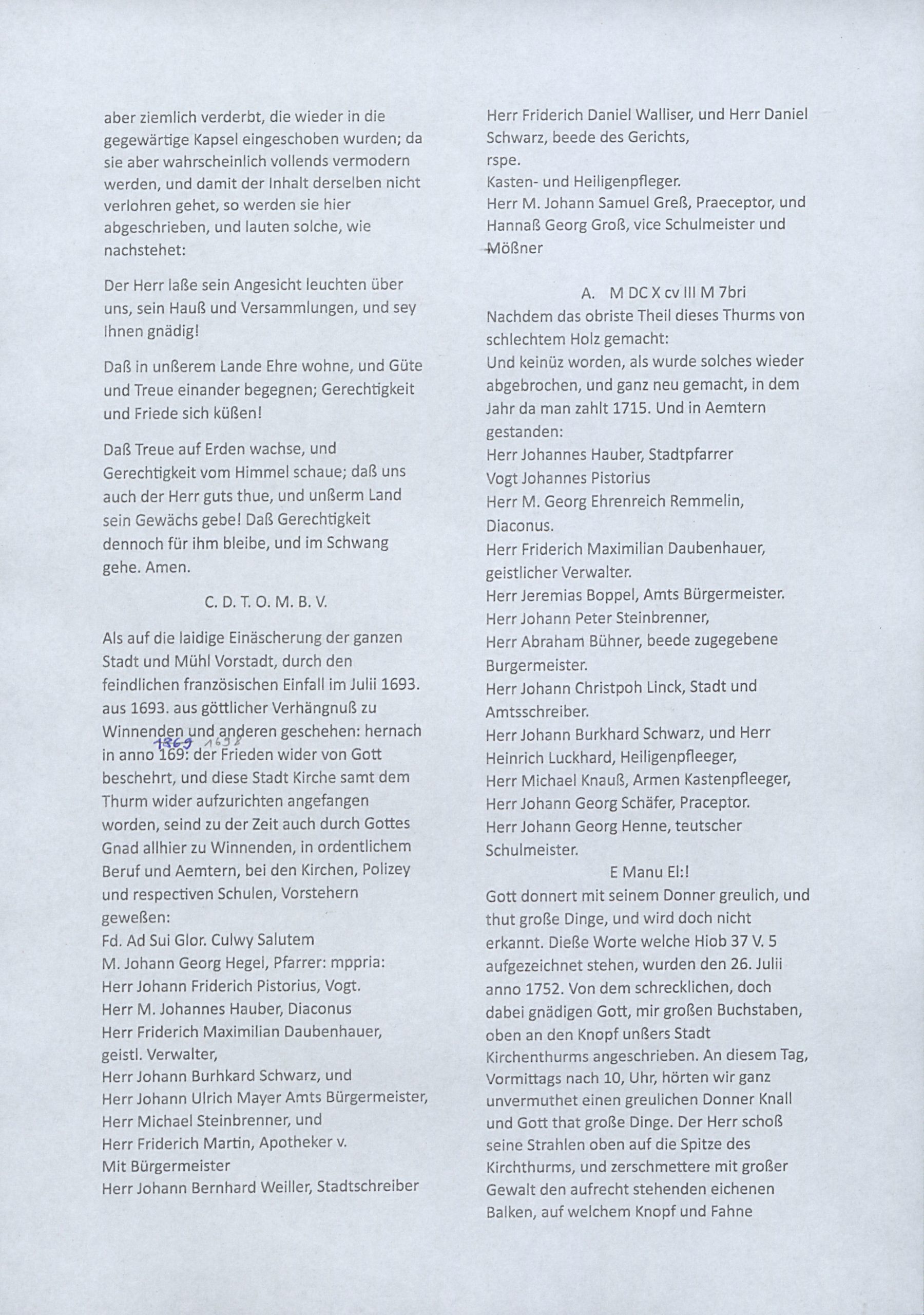 Die Turmkugel enthielt eine Kapsel mit Dokumenten aus den Jahren 1698, 1715, 1752, 1793, 1948 und 1977. Immer wieder musste die Turmkugel aufgrund von Materialermüdung, Blitzschlag oder Kriegseinwirkungen repariert oder ausgebessert werden, wie aus den Texten hervorgeht. Die Dokumente in der Zeitkapsel enthalten spannende Informationen über Naturereignisse, historische Ereignisse und technische Entwicklungen. Bei den diesjährigen Renovierungsarbeiten wurden der Zeitkapsel weitere Dokumente beigefügt.