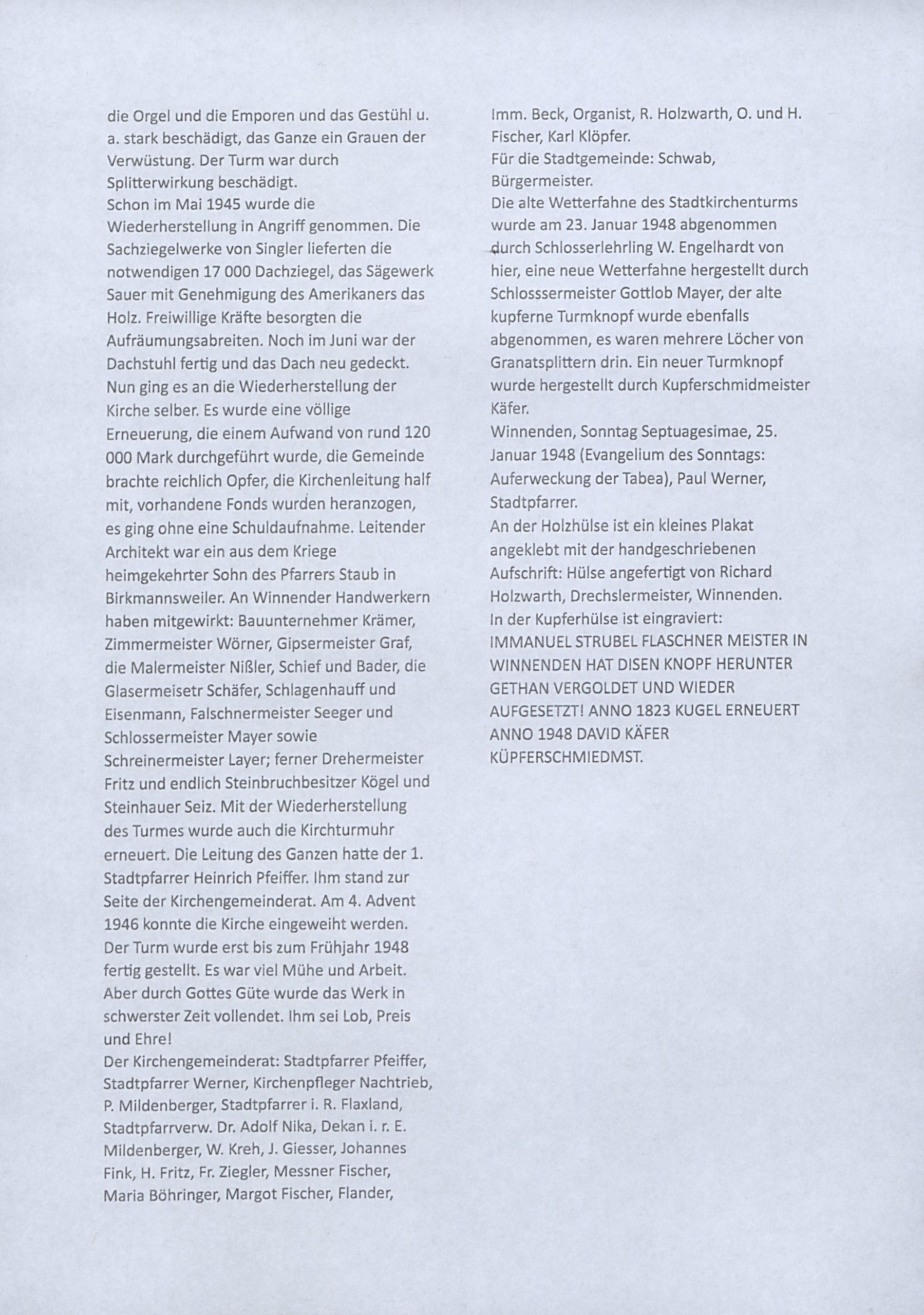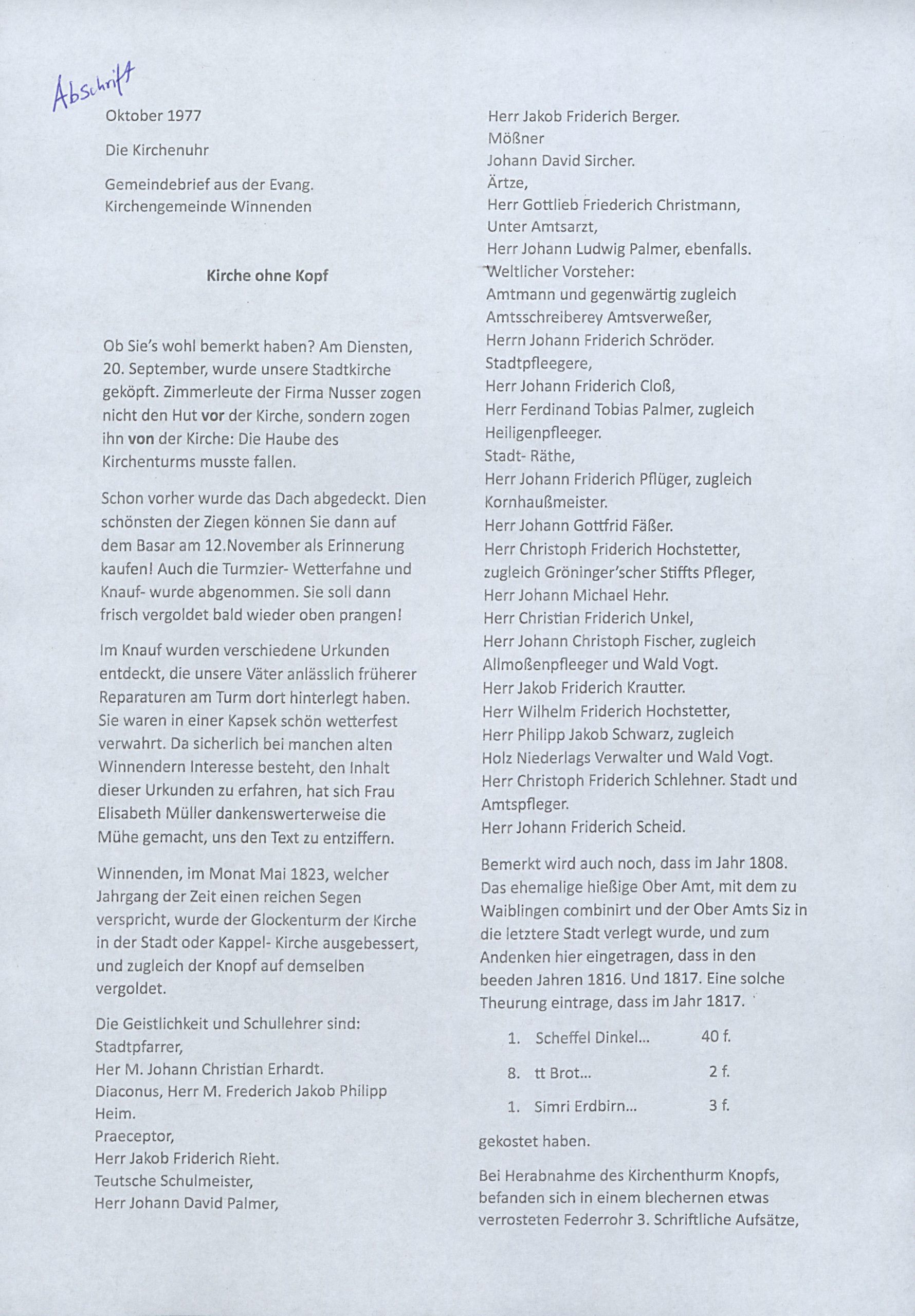 Bei der Renovierung der Stadtkirche St. Bernhard in Winnenden stellte sich die Frage nach dem Verbleib der Zeitkapsel in der Turmkugel. Die Turmkugel bzw. der Turmknauf ist eine runde, vergoldete Metallkapsel, die auf der Turmspitze unterhalb des Turmkreuzes angebracht ist. Aufgrund ihrer relativen Unzugänglichkeit galten Turmknäufe als sichere Aufbewahrungsorte für historische Zeugnisse aus der Bauzeit, wie zum Beispiel Zeitungen oder Münzen der damaligen Zeit, die man der Nachwelt überliefern wollte. Für die darin aufbewahrten Dokumente bürgerte sich die Bezeichnung „Kirchturmknopfakte“ oder „Turmakten“ ein. Zu den darin zu erwartenden Dokumenten gehören neben Aufzeichnungen der jeweiligen Kirchengemeinde auch Auszüge aus Geburts- und Sterberegistern sowie Berichte über besondere Ereignisse zur Bauzeit.