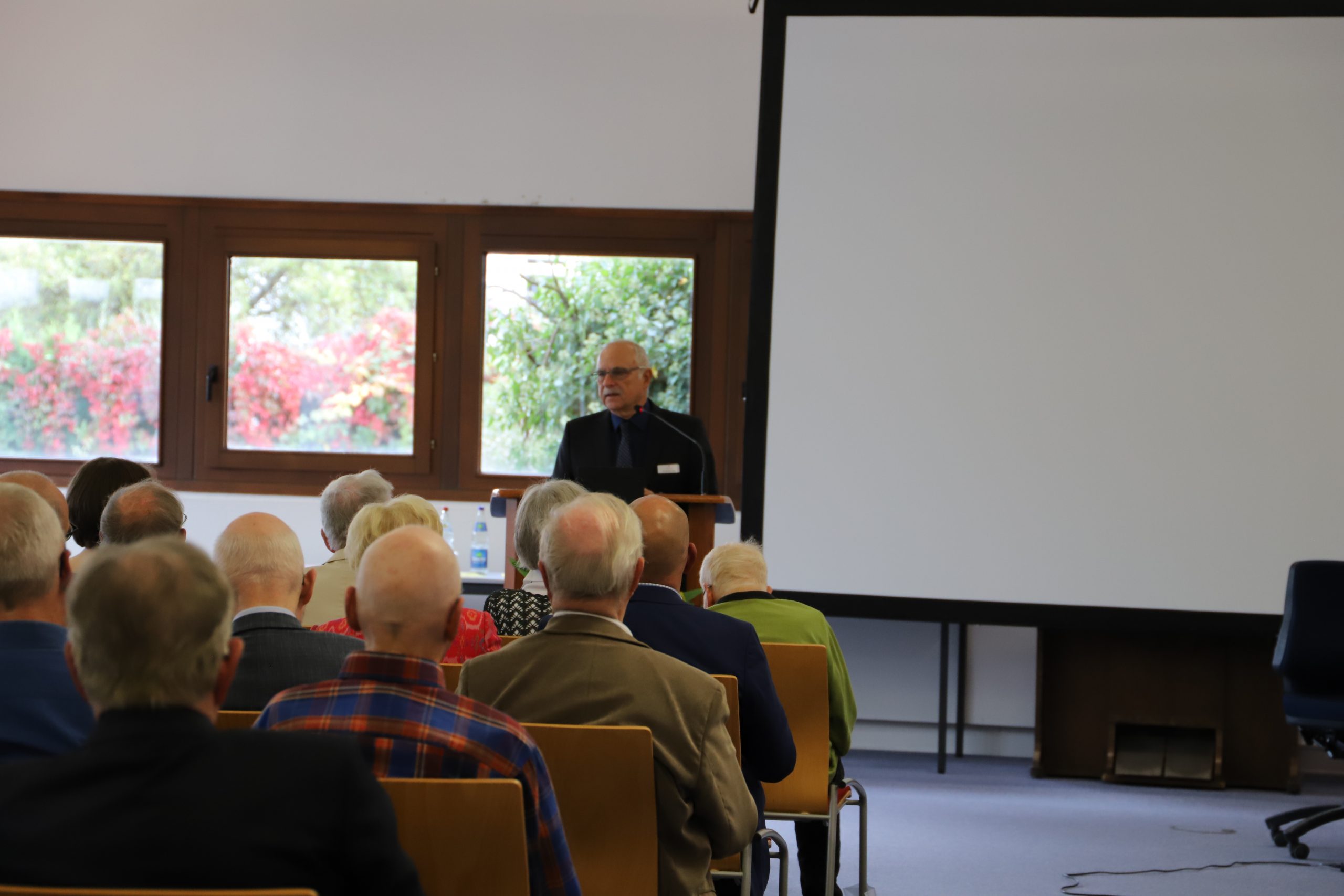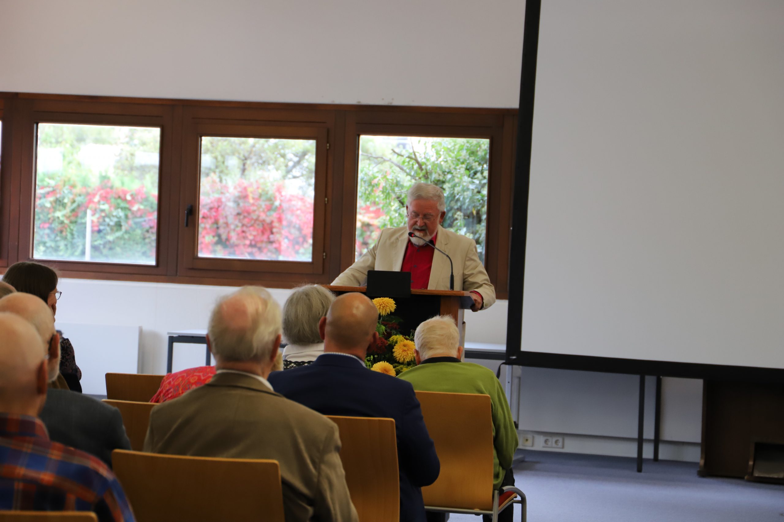 Am Freitag, 6.10.2023, fand mit circa 70 Gästen aus Nah und Fern ein Festakt zur Würdigung des Gelehrten Dr. Christoph Weismann im Lesesaal von Archiv und Bibliothek statt. Professor Dr. Hermann Ehmer, ehemaliger Referatsleiter von Archiv und Bibliothek, hielt den Festvortrag und konnte mit vielen Anekdoten aus dem Leben des Gelehrten Begeisterung hervorrufen. Dr. Weismann besaß eine private Bibliothek mit ca. 14 000 Büchern. Diese sowie andere handschriftliche Archivalien wurden inzwischen dem Archiv der Landeskirche und der Evangelischen Hochschul- und Zentralbibliothek überlassen. Eine kleine Ausstellung wurde im Foyer aufgebaut. Auch das Manuskript seiner Brenz-Bibliographie, die 2016 fertiggestellt und herausgegeben wurde, ist in einer der Vitrinen zu bestaunen.
