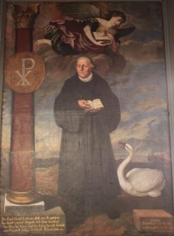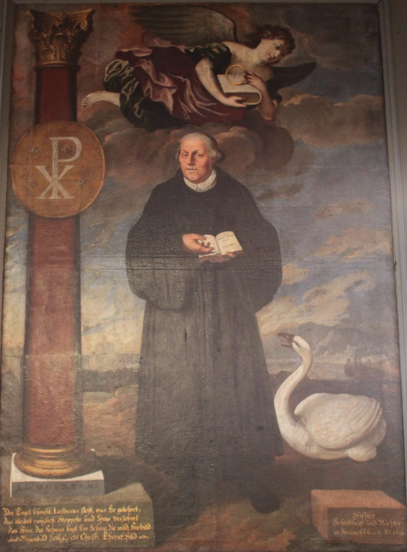 Trotz seiner vielseitigen Persönlichkeit wurde Martin Luther immer wieder in Anlehnung an das von Lucas Cranach (1472-1553) gemalte Porträt von 1528 mit schwarzem Talar, Barett und strengem Gesichtsausdruck dargestellt, obwohl Luther selbst geäußert hatte, er wolle mit einem Schwan porträtiert werden, und zwar in Anlehnung an eine Prophezeiung, die der damals in Konstanz gefangene böhmische Reformator Jan Hus (um 1370-1415) Ende 1414 geäußert hatte. Man werde im Gefängnis eine Gans braten – denn Hus heißt auf Deutsch Gans -, aber nach hundert Jahren werde man einen Schwan singen hören. In einer Glosse von 1531 bezog Luther diese Aussage von Hus auf seine eigene Person. So entstand die Bildtradition von Luther und dem Schwan. Ein erstes Motiv dieser Art stammt aus dem Jahr 1603 von Jacob Jacobs und hängt in der Hamburger Hauptkirche St. Petri. Ein weiteres Beispiel aus der Evangelischen Landeskirche in Württemberg ist das 1698 von Georg Friedrich List geschaffene Wandbild in der Pfarrkirche St. Jodokus in Strümpfelbach im Kirchenbezirk Waiblingen. Wie in Hamburg steht auch in Strümpfelbach Martin Luther im schwarzen Talar im Mittelpunkt des Bildes. In Strümpfelbach hält er die aufgeschlagene Bibel in den Händen, während über ihm ein Engel mit Buch und Ring schwebt. Der Engel symbolisiert den himmlischen Schutz der Bibel und der neuen Lehre, mit der Martin Luther durch den Ring eng verbunden ist. Links von Luther steht eine Säule auf einem Sockel mit dem Christusmonogramm als Symbol für den rechten Glauben an Jesus Christus und die Standhaftigkeit Martin Luthers. Rechts von Luther steht ein Schwan mit weit geöffnetem Schnabel, der sich der Person Luthers zuwendet, als Symbol für die Fortdauer der Reformation.