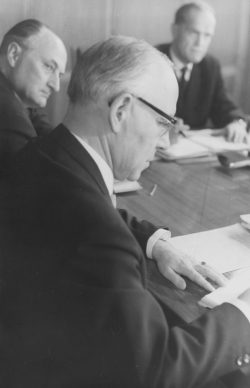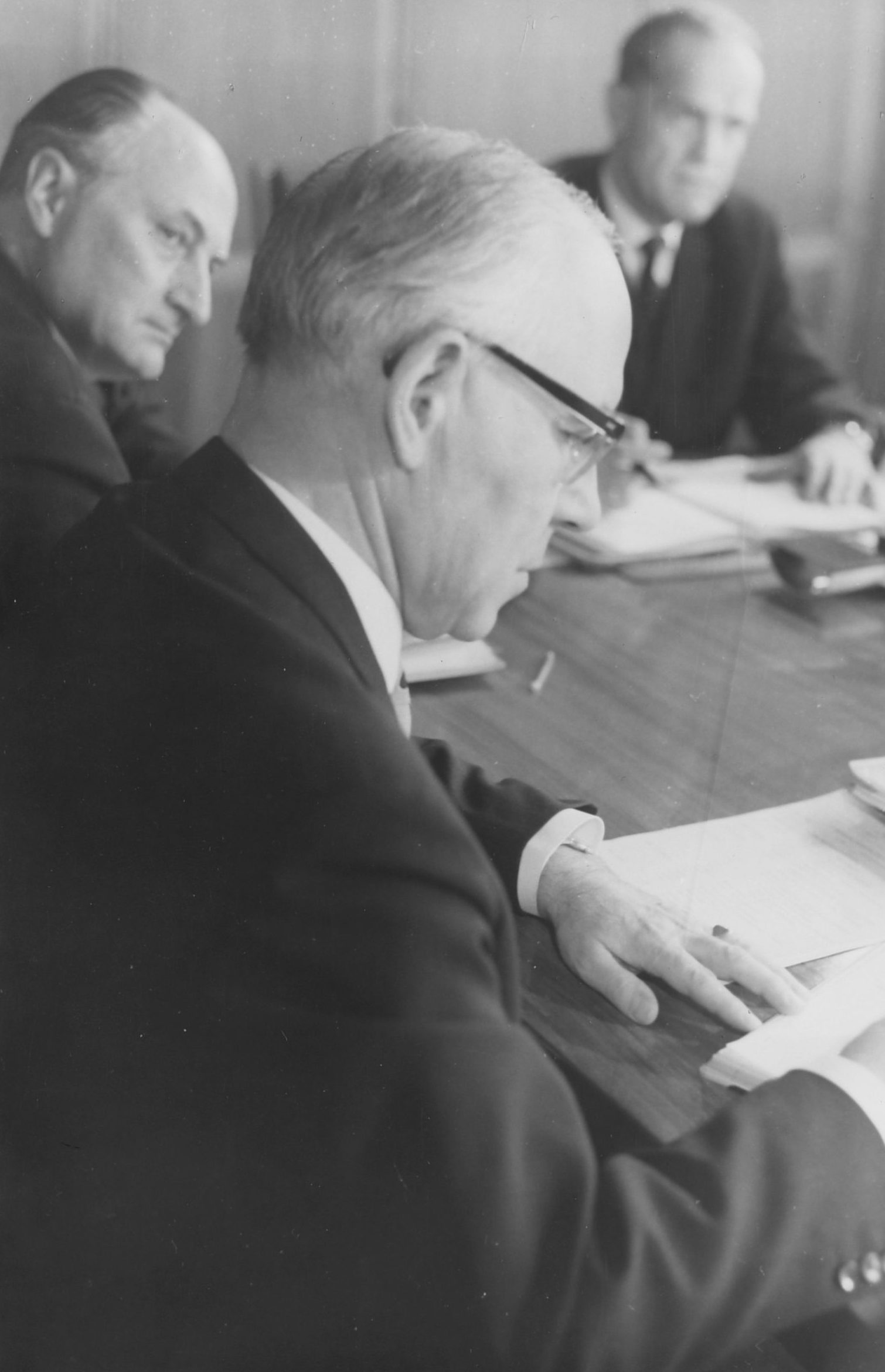 Beitragsbild: Sitzung mit OKR Hans Ostmann (am Tisch vierter von links), am Tischende Landesbischof Eichele. Foto: Ton- und Bilddienst der Evang. Landeskirche Württemberg, LKAS.