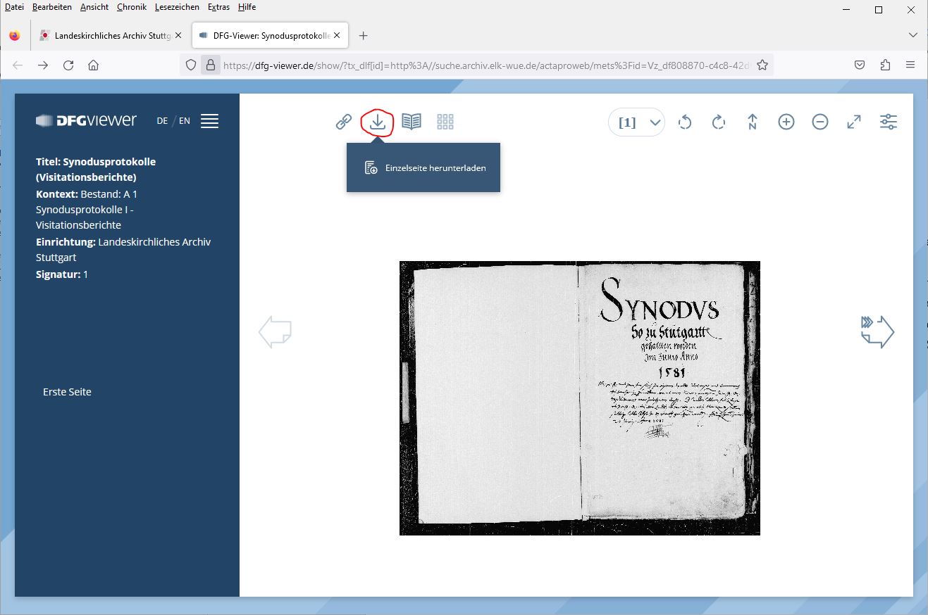 Zum anderen können aus dem DFG-Viewer die Digitalisate in hoher Auflösung einzeln heruntergeladen werden. Dies geschieht über einen Linksklick auf das Download-Symbol (siehe Bild) und anschließendem Rechtsklick auf „Einzelseite herunterladen“. Abhängig vom verwendeten Browser kann das jeweilige Digitalisate über „Ziel speichern unter …“ o.ä. auf die eigene Festplatte gespeichert werden.