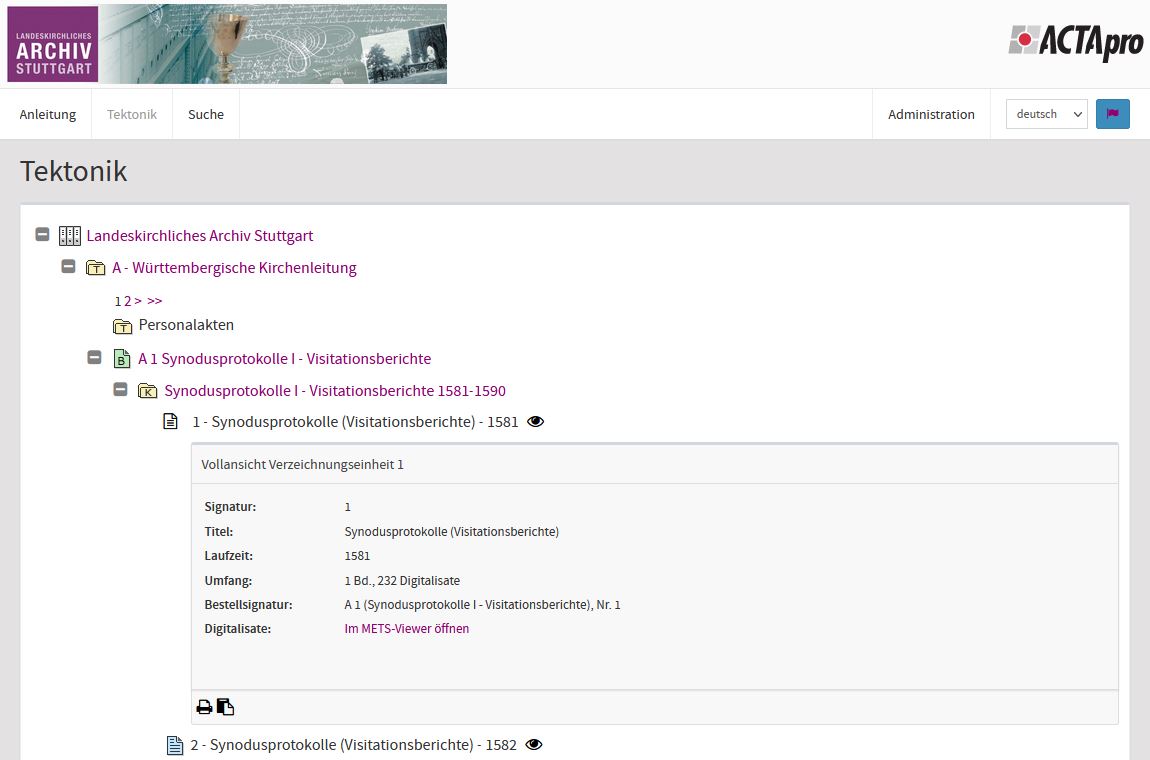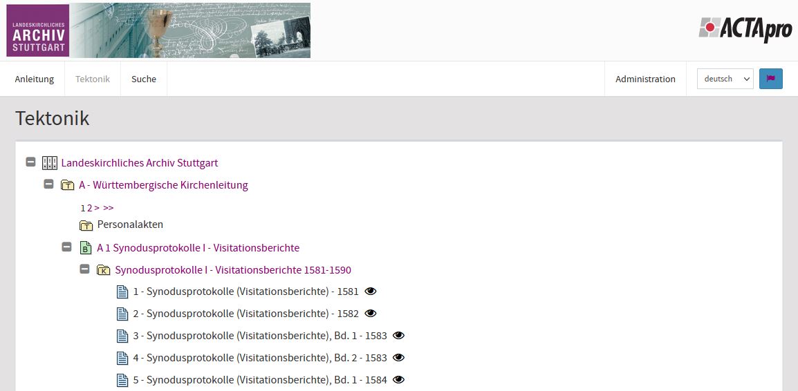 Zum einen sind Verzeichniseinheiten, die Digitalisate enthalten, welche mit dem DFG-Viewer geöffnet werden, bereits in der Tektonik anhand des Augen-Symbols erkennbar. Die Digitalisate können durch Klick auf das Auge direkt aus der Tektonik geöffnet werden.