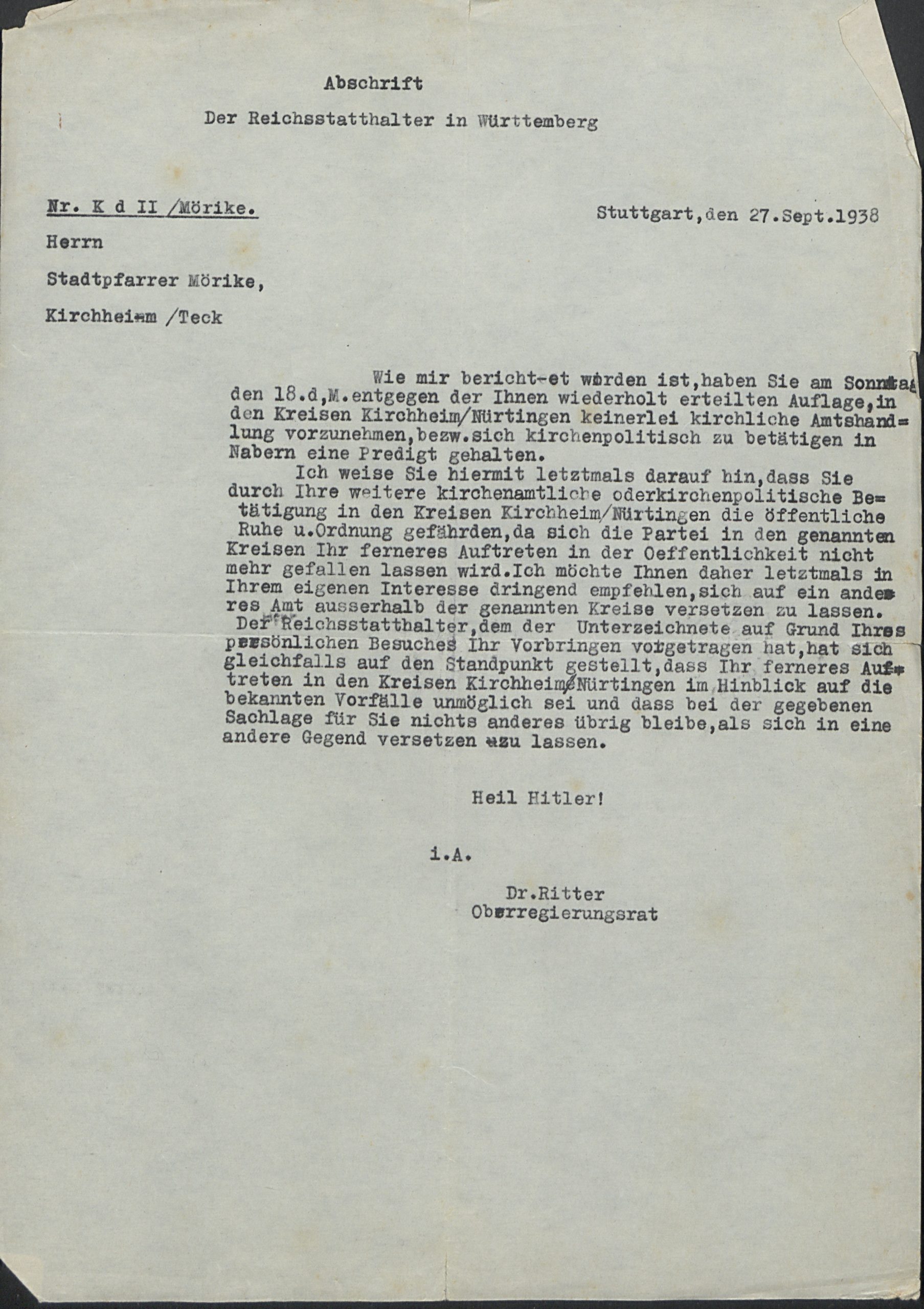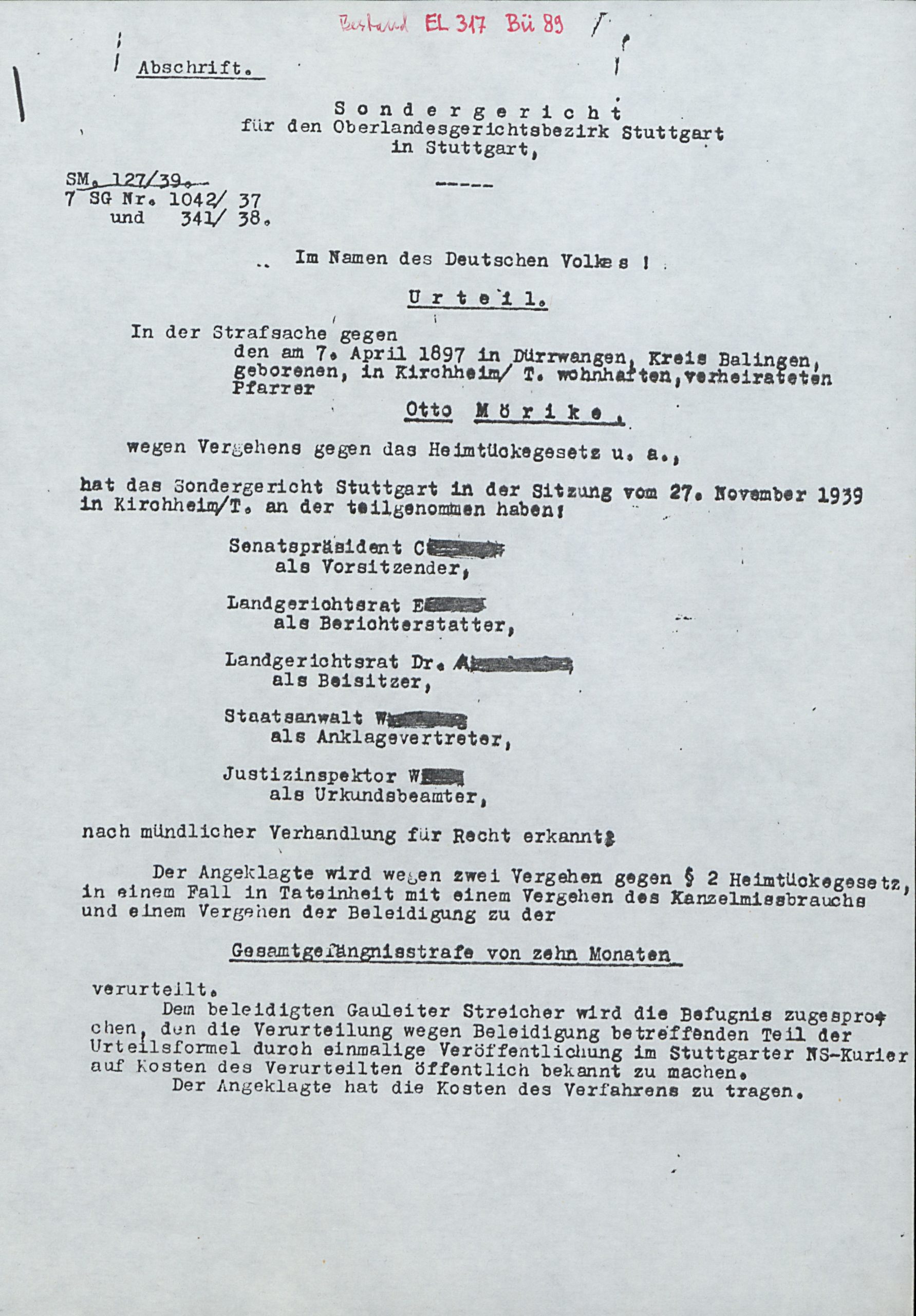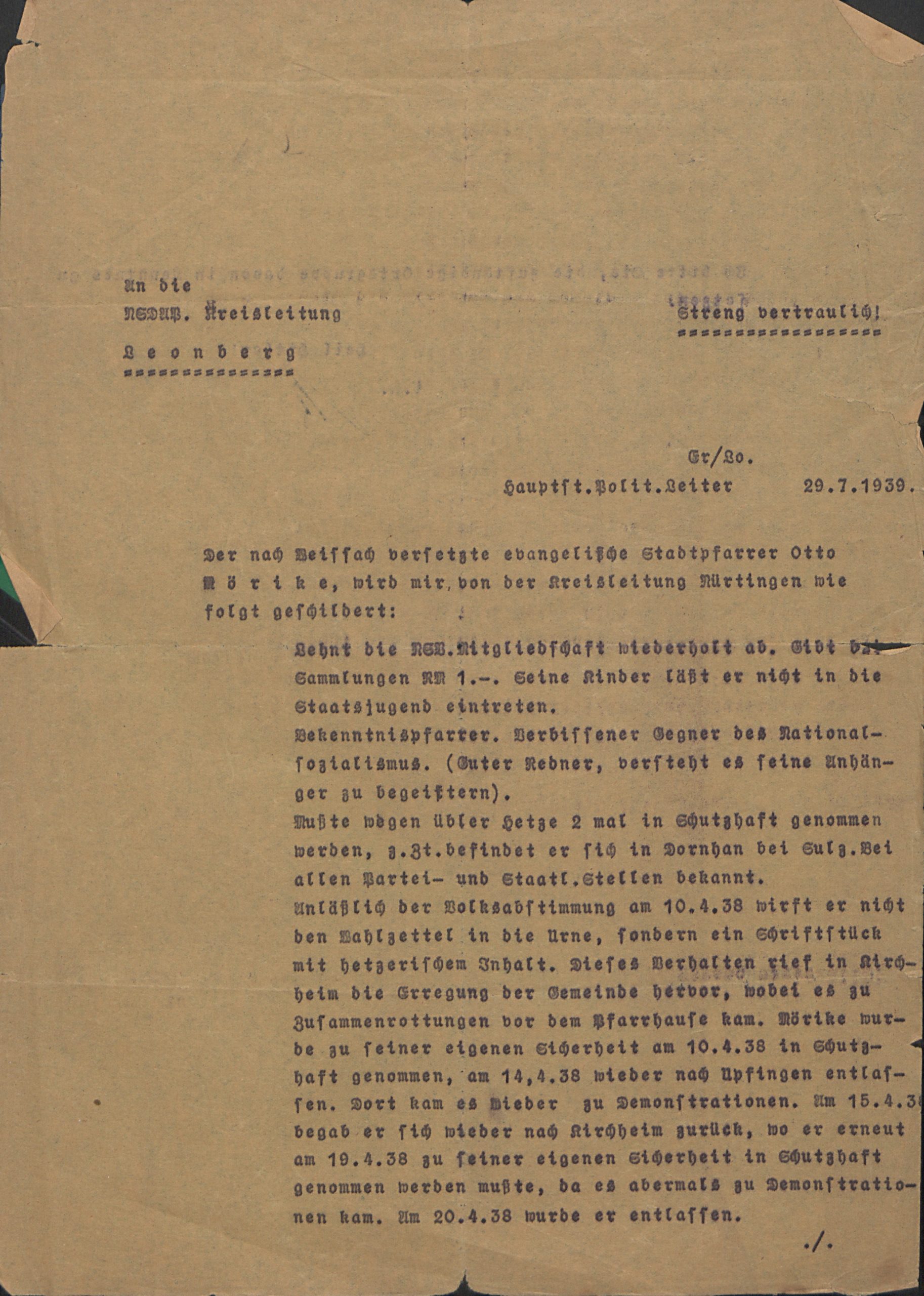Otto Mörike (7. April 1897 – 9. Juli 1978) war ein evangelischer Pfarrer der Evangelischen Landeskirche in Württemberg, der vor allem durch sein Engagement gegen den Nationalsozialismus und die Verfolgung der jüdischen Bevölkerung bekannt wurde. Er war Mitglied der Pfarrhauskette. Nach dem Ersten Weltkrieg, in dem er drei Jahre an der Front kämpfte und unter anderem die Schlacht von Verdun (1915) und die Schlacht an der Somme (1916) miterlebte, studierte er evangelische Theologie an der Eberhard-Karls-Universität in Tübingen und absolvierte sein anschließendes Vikariat in Oberboihingen. Dort lernte er auch seine Frau Gertrud Mörike (geb. Lörcher) kennen, die er 1926 in Oppelsbohm, seiner damaligen Wirkungsstätte, heiratete. 1935 übernahm er eine Pfarrstelle in Kirchheim/Teck. Zunächst von den Versprechungen der Nationalsozialisten überzeugt, schloss er sich bald der Bekennenden Kirche an. Immer wieder geriet er in Konflikt mit dem nationalsozialistischen Regime. Bereits 1936 wurde ihm die Lehrerlaubnis für den Religionsunterricht entzogen, 1938 warfen Mörike und seine Frau bei der Abstimmung über den Anschluss Österreichs an das Deutsche Reich – auch das ist in diesem Nachlass überliefert – anstelle eines Stimmzettels eine ausführliche Erklärung ein, warum sie dem Anschluss nicht zustimmen konnten. Noch am selben Tag wurde er von einer von der Gestapo aufgehetzten Menschenmenge schwer verletzt, auch das Pfarrhaus wurde beschädigt. Wegen „Vergehens gegen das Heimtückegesetz“, „Kanzelmissbrauchs“ und „Beleidigung“ wurde er zu 10 Monaten Gefängnis auf Bewährung verurteilt und erhielt Rede- und Aufenthaltsverbot in Kirchheim/Teck.