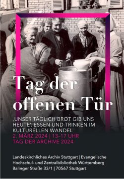 Der Tag der offenen Tür von Landeskirchlichem Archiv Stuttgart und EHZ-Bibliothek findet anlässlich des 12. Tags der Archive statt, der in diesem Jahr unter dem Motto „Essen und Trinken” steht. Der Tag der Archive ist eine Initiative des Verbands deutscher Archivarinnen und Archivare e. V. (VdA), um die vielfältigen gesellschaftlichen Funktionen der Archive hervorzuheben. Der bundesweite Aktionstag findet alle zwei Jahre statt.