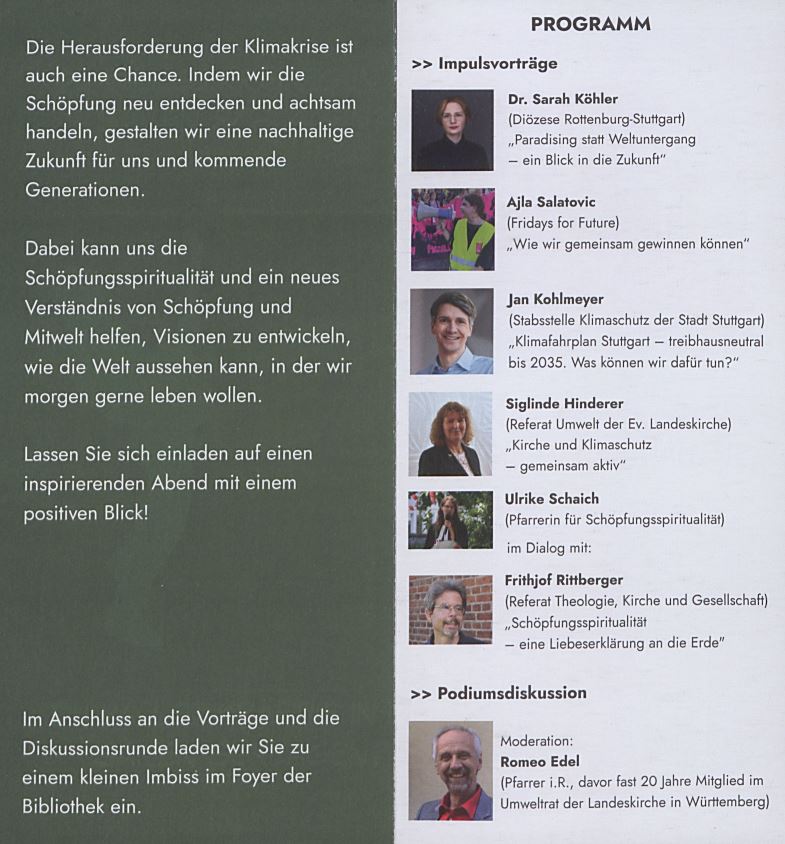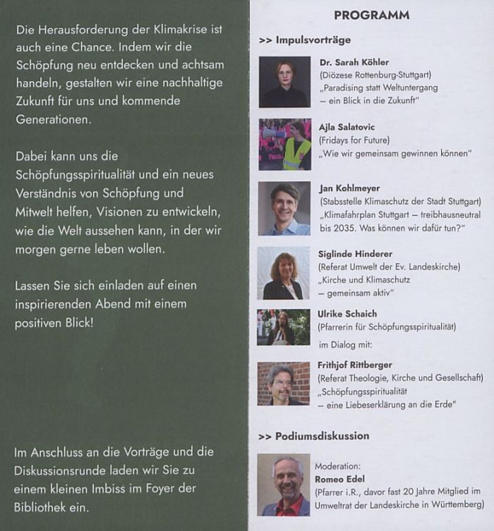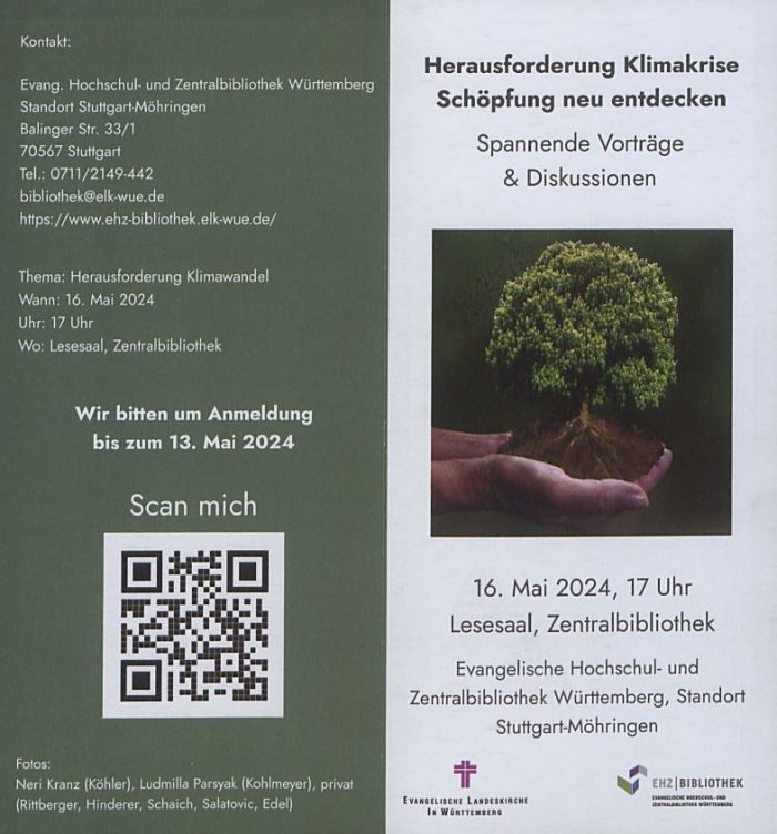 Am Donnerstag, den 16. Mai, um 17 Uhr veranstaltet die Evangelische Hochschul- und Zentralbibliothek in der Balinger Straße 33/1 in Stuttgart-Möhringen eine Abendveranstaltung zum Thema Klimakrise. Die Teilnehmenden erwarten Impulsvorträge von Dr. Sarah Köhler (Diözese Rottenburg-Stuttgart), Ajla Salatovic (Fridays for Future), Jan Kohlmeyer (Stabsstelle Klimaschutz der Stadt Stuttgart), Siglinde Hinderer (Umweltreferat der Landeskirche), Ulrike Schaich (Pfarrerin für Schöpfungsspiritualität), Frithjof Rittberger (Referat Theologie, Kirche und Gesellschaft). Die Podiumsdiskussion im Anschluss an die Vorträge moderiert Romeo Edel. Danach bietet ein kleiner Imbiss die Möglichkeit für Austausch im lockeren Gespräch.