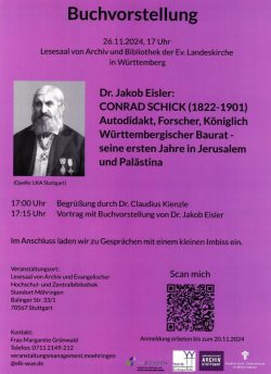 Am 26. November 2024 um 17.00 Uhr präsentiert er im Lesesaal der Evangelischen Hochschul- und Zentralbibliothek und des Landeskirchlichen Archivs sein neues Werk „Conrad Schick (1822-1901) – Autodidakt, Forscher, Königlich Württembergischer Baurat. Seine ersten Jahre in Jerusalem und Palästina“. Dazu sind Sie herzlich eingeladen. Hier können Sie sich anmelden. Im Anschluss wird zu einem kleinen Imbiss eingeladen.