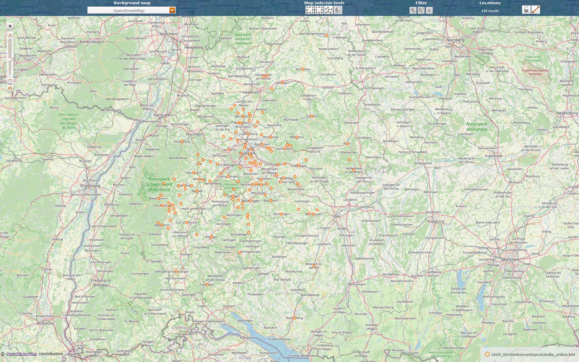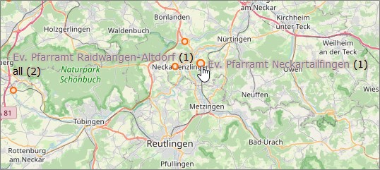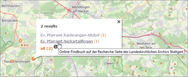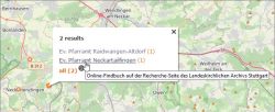 Auf der ersten Karte können über die orangen Punkte die Informationen zu den Archiven der Dekanats- bzw. Pfarrämter angezeigt werden, wohin der jeweilige Ort eingepfarrt ist bzw. war. Aufgrund teils wechselnder Filialverhältnisse können bei einigen Orten auch mehrere Archivbestände angezeigt werden. Durch einen Klick auf den Namen des Dekanats- bzw. Pfarramtes kann direkt zum entsprechenden Bestand auf der Rechercheseite des Archivs gesprungen werden. Die Struktur des Bestandes kann dort über das weiße Kreuz auf schwarzem Grund aufgeklappt werden. Weitere Informationen zur Benutzung der Rechercheseite sind auf suche.archiv.elk-wue.de zu finden.