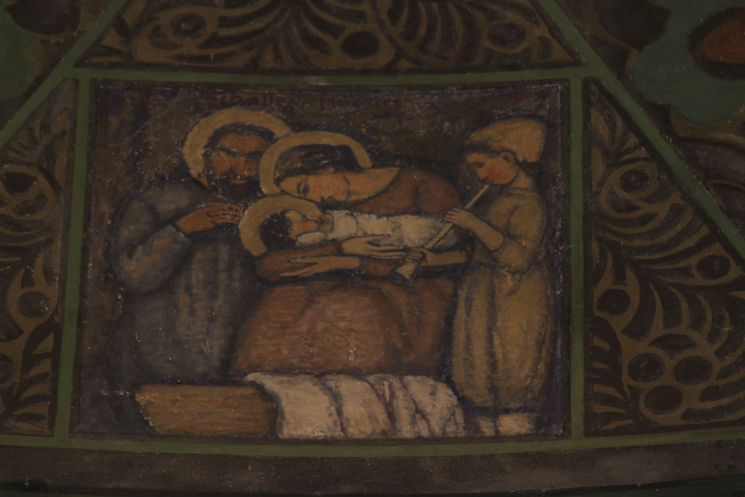 Die 1911-1913 von Martin Elsaesser erbaute evangelische Kirche in Stuttgart-Gaisburg, malerisch auf einem Hügel gelegen, zeigt in der Chorapsis einen Bilderzyklus von Käte Schaller-Härlin (1877-1973), die mit dem Architekten Martin Elsaesser an mehreren Kirchen in Württemberg zusammengearbeitet hat. Die Wandmalereien mit Darstellungen aus dem Alten und Neuen Testament widmen sich der Weltgeschichte und dem Leben Jesu von der Erschaffung des Menschen bis zur Auferstehung Christi. Eine der giebelartigen Darstellungen, die die Fensterzone krönt, zeigt die Geburt Christi im Stall von Bethlehem, die aufgrund ihrer außergewöhnlichen Inszenierung eine nähere Betrachtung verdient. Die Krippe ist auf einen Balken im Vordergrund reduziert, über dem ein weißes Tuch hängt. Dahinter sitzt Maria, leicht im Profil dargestellt, und hält mit beiden Händen das auf ihrem Schoß liegende Jesuskind, das durch ein kleines Kissen im Nacken bequem gebettet ist. Rechts hinter Maria steht Josef, der mit zum Gebet gefalteten Händen und zusammengezogenen Augenbrauen um Mutter und Kind bangt, denn die junge heilige Familie, deren Mitglieder alle einen Heiligenschein tragen, hat in der kalten Nacht keinen wirklichen Schutz. In dieser scheinbar ausweglosen Situation versucht Maria, das Kind so gut es geht zu wärmen, indem sie ihre Arme unter das Kind legt, es leicht an ihre Brust drückt und ihm den Kopf so weit wie möglich zuwendet, um sofort zu spüren, wenn das Kind aufwacht. Von Zuversicht zeugt dagegen der Hirtenjunge am rechten Bildrand, der sich der Familie zuwendet und das Kind mit dem Spiel auf seiner Schalmei in den Schlaf begleitet. Trotz der Besorgnis, die man Joseph anmerkt, wirkt die Szene ruhig und friedlich, da Maria und der Hirtenjunge sich nur darauf konzentrieren, das schlafende Kind auf keinen Fall zu stören, sondern es weiter schlafen zu lassen. Der Reduktion im Bewegungsablauf der Figuren entspricht auch ihre Körperdarstellung, die nicht in natürlichen, plastisch ausformulierten Zügen, sondern in eher großen Flächen mit dicken schwarzen Umrisslinien wiedergegeben ist, wobei gerade die Gesten und Gebärden an Bedeutung gewinnen. In dieser Konzentration auf das Wesentliche kulminiert die sanfte Expressivität dieser zentrierten Malerei, die die Geburt Jesu in uns lebendig werden lässt. Gerade in diesem Sinne dürfen wir auch in Zeiten großer Umbrüche und Veränderungen immer wieder neu zuversichtlich sein.