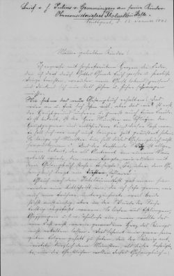 Am 12. Januar 1842 schrieb Julius Freiherr von Gemmingen (1774-1842) in Stuttgart an „Meine geliebten Kinder“. Gemeint sind damit seine Tochter Mathilde (1816-1894) und ihr Mann, der berühmte Theologen August Tholuck (1799-1877), dessen zweite Ehefrau sie war. Mathilde Tholuck hat sich als Begründerin der Diakonissenanstalt in Halle bleibende Verdienste erworben.