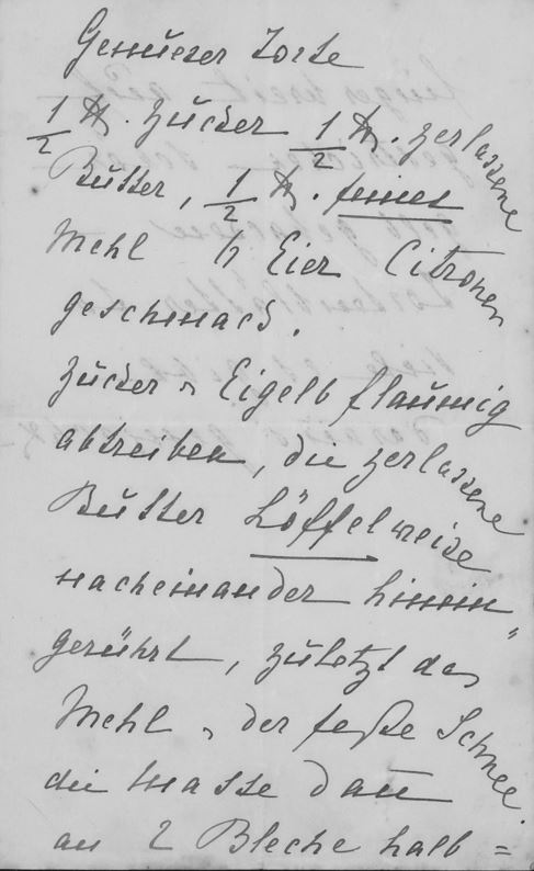 - Lesezeichen mit Rezept fürr Genueser Torte im Tagebuch des Vaters, 1912, recto. LKAS, D 139, Nr. 62.