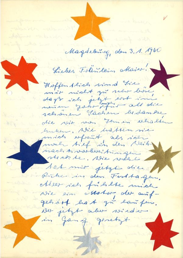 Die Korrespondenz der beim Landesverband angestellten Jugendleiterinnen – ab den 1970er Jahren Sozialpädagoginnen genannt – ermöglicht zusätzlich einen Einblick in die Kindergartenarbeit in der DDR. Unter dem Stichwort „Osthilfe“ wurden von der EKD „Patenkindergärten“ in der „sowjetisch besetzten Zone“ vermittelt. Die Dankschreiben zeigen die Freude über erhaltene Pakete mit Spiel- und Bastelmaterialien und geben Aufschluss über die nicht ganz einfache evangelische Kindergartenarbeit in Ostdeutschland.