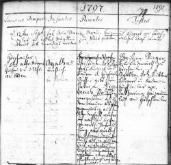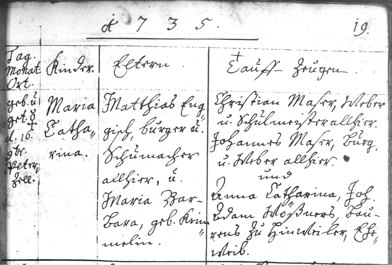 Am 16. November 1735 wurde in Peterzell bei Alpirsbach das Mädchen Maria Catharina geboren und getauft. Ihre Eltern waren Matthias Engisch, Bürger und Schuhmacher in Peterzell, und Maria Barbara Krimmel.[6] Üblicherweise wird bei der Ahnenforschung als nächster Schritt nach dem Hochzeitseintrag der Eltern gesucht – jedoch, es gibt keinen im Eheregister von Peterzell. Auch über den hervorragenden Index zu den Kirchenbüchern („Sonstiges 1648 bis ca. 1875 Band 20“) wird man nicht fündig. Aus dem Index ist lediglich zu entnehmen, dass das erste Kind des Ehepaares am 24. Mai 1732 geboren wurde.[7]