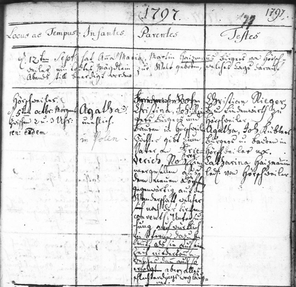 Im Taufregister von Tumlingen (heute Kirchengemeinde Waldachtal) ist unter dem 5. Oktober 1797 der Geburts- und Taufeintrag des im Filialort Hörschweiler unehelich geborenen Mädchens Agatha zu finden. Zu ihren Eltern ist folgendes vermerkt: „Christina, Joh. Riegers Bürgers und Bauren in Hörschweiler Tochter gibt zum Vater an Friederich Rohrer, Zimmergesellen aus dem neuen Dörfchen, gegenwärtig auf der Wanderschaft, welcher sich nach der kirchenconventl. Untersuchung auch würklich in so ferne dazu bekennt, als sie auf seine Zeit niederkommen, welches dann auch so erfolgt, aber alles schlechterdings wegläugnet“.[2] Genauere Informationen zu Friedrich Rohrer sind nicht zu finden.