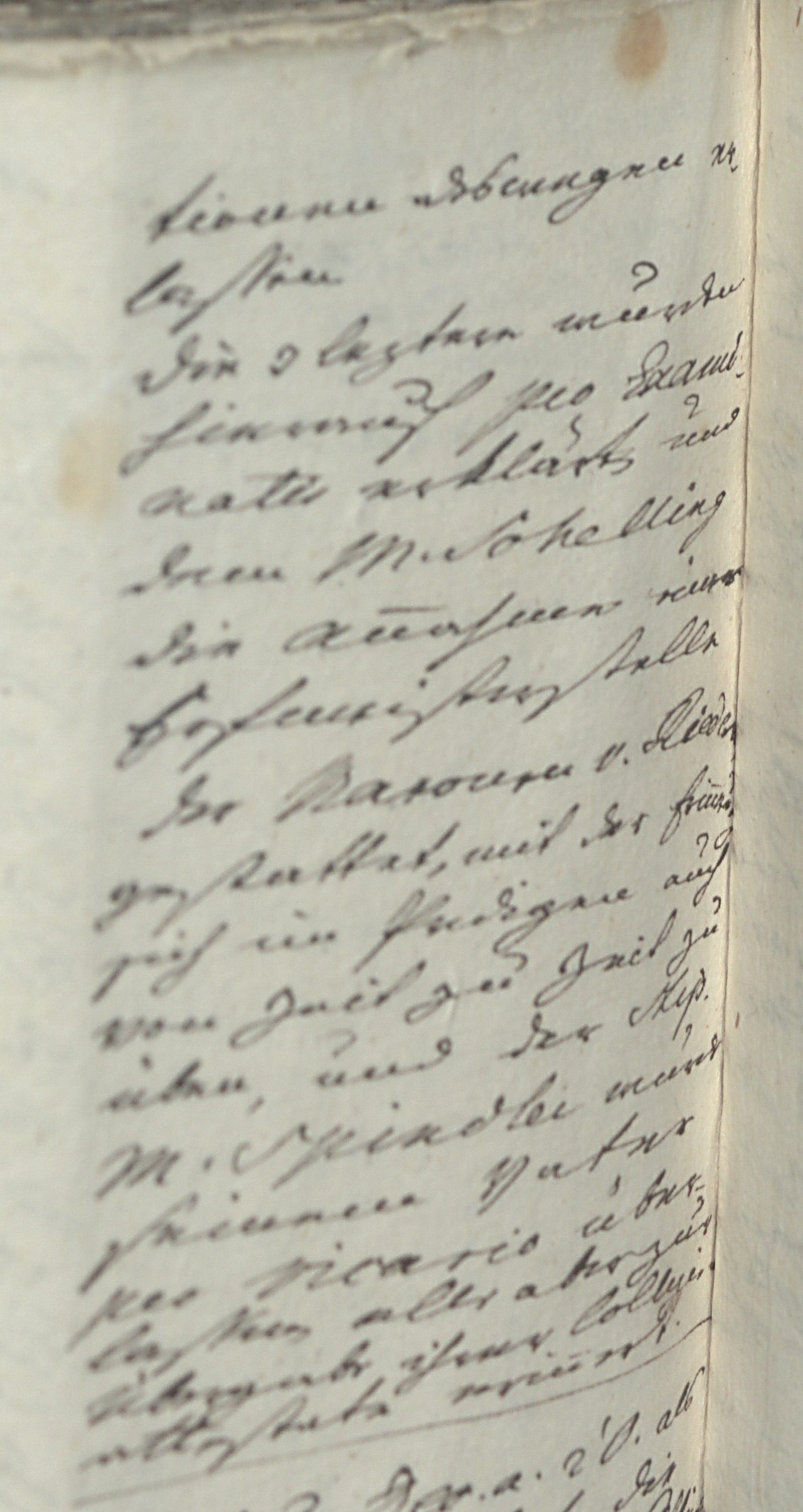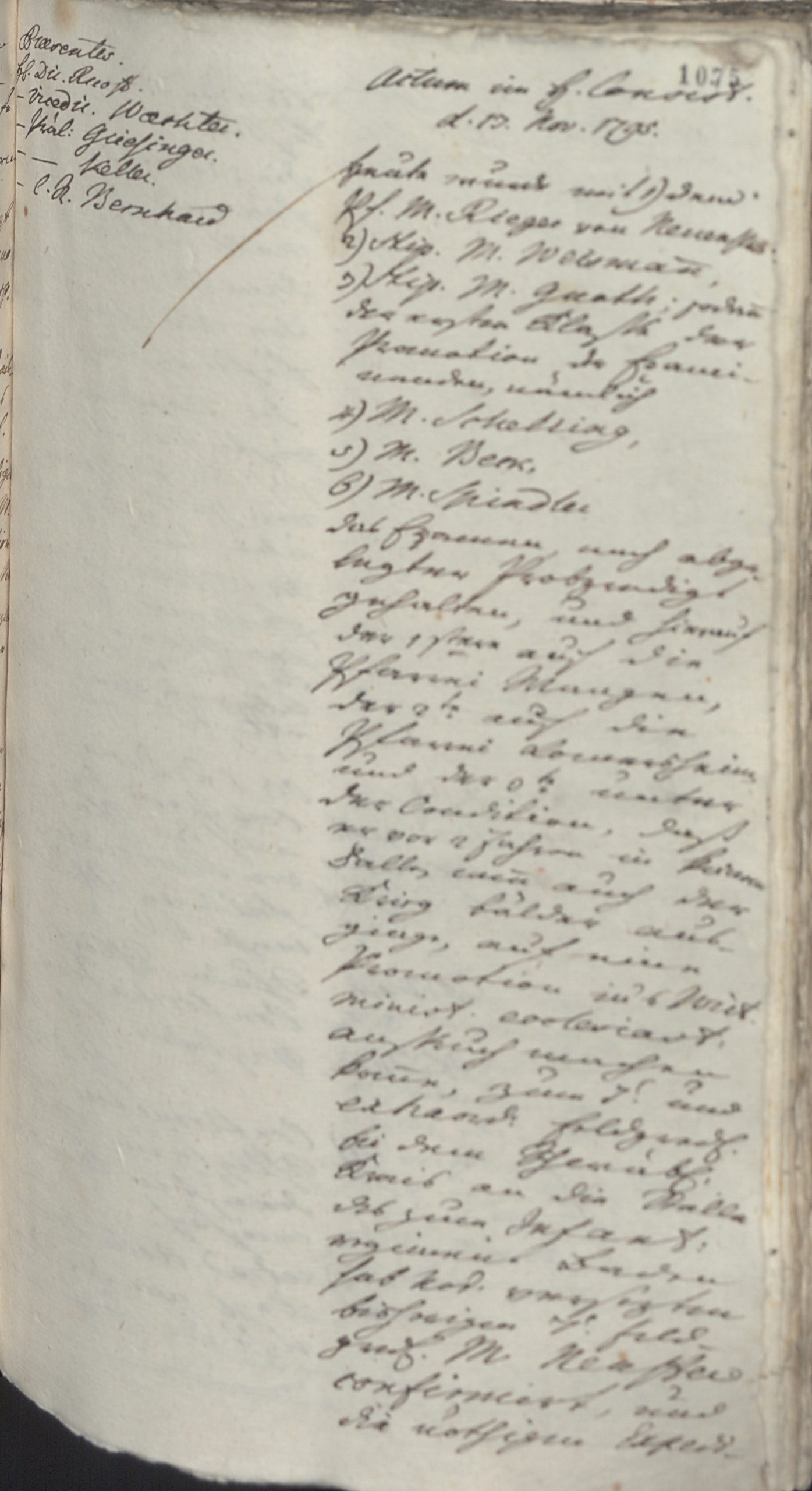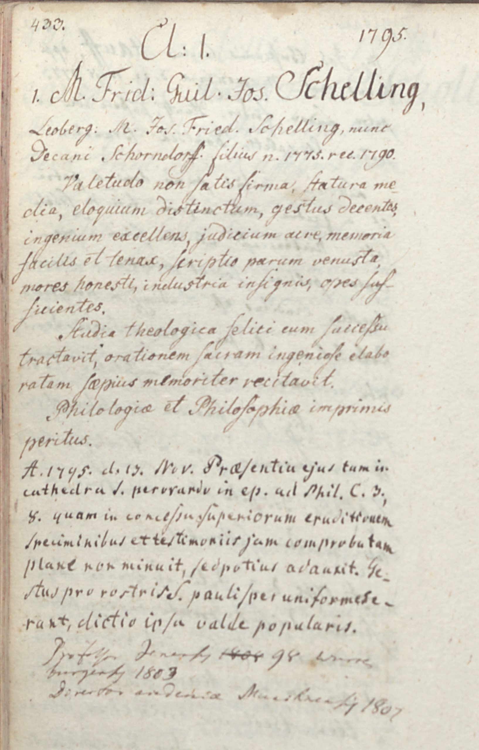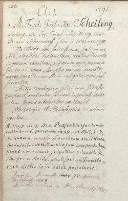 - Eintrag zur Prüfung Schellings vor dem Konsistorium im Protokoll vom 13.11.1795. EABW, LKAS Stuttgart, A3, Bd. 63, p. 1075. recto