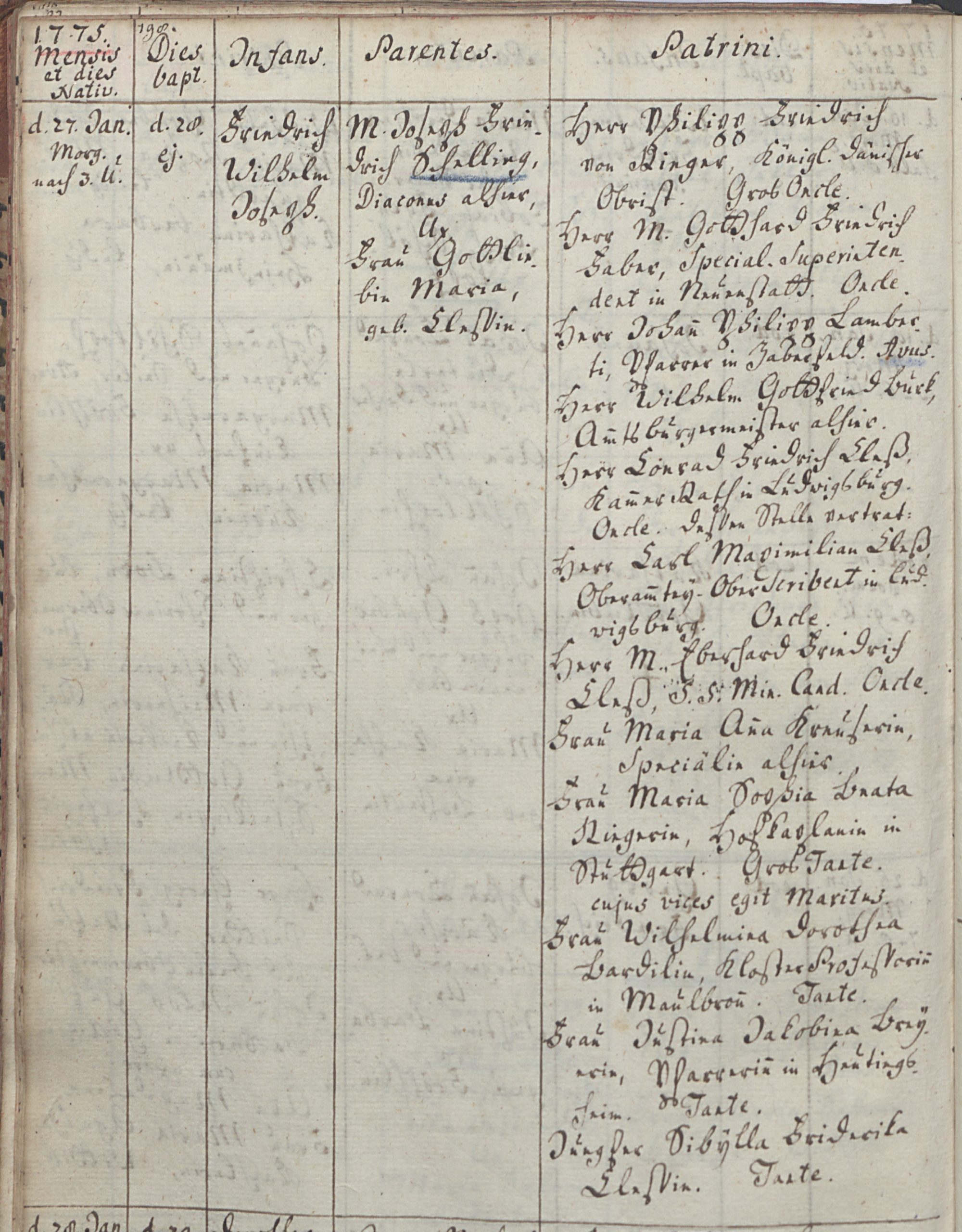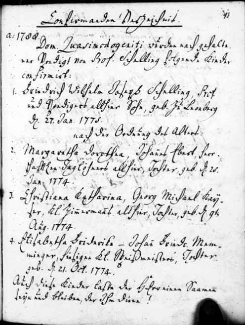 In diesem Jahr feiern wir den 250. Geburtstag von Friedrich Wilhelm Joseph Schelling. Friedrich Wilhelm Joseph Schelling, der am 27. Januar 1775 in Leonberg geboren wurde. Das ist Grund genug, einige Quellen zu seiner Person aus den Beständen des Landeskirchlichen Archivs vorzustellen. Er wurde als Sohn des Diakons Joseph Friedrich Schelling, Inhaber der zweiten Stadtpfarrerstelle, im Pfarrhaus geboren, das nur wenige Schritte von der Stadtkirche entfernt liegt. Im Taufregister (1761–1807) der Leonberger Kirchengemeinde hat sich der Eintrag zu seiner Taufe erhalten. Dem Eintrag ist zu entnehmen, dass er am 27. Januar nach drei Uhr morgens geboren wurde und am darauffolgenden Tag getauft wurde, vermutlich durch seinen Vater. Ihm verdankt er auch seinen dritten Taufnamen Joseph, während er den Namen Wilhelm aufgrund seiner Tante und Taufpatin Wilhelmine Dorothea Bardili erhielt. Den Namen Friedrich trug sein Vater als zweiten Vornamen, ebenso sein Großvater, der ebenfalls Pfarrer war. Seine Mutter, Maria Gottliebin, geborene Cless, stammte ebenfalls aus einer württembergischen Pfarrersfamilie. In protestantischen Pfarrhäusern herrschte ein günstiges Klima für das, was man als „Bildung“ bezeichnet, denn Pfarrer mussten von Berufs- und Standes wegen gebildet sein. Dies blieb nicht ohne Auswirkung auf die Familie, da die Söhne nach dem Durchlaufen der entsprechenden Ausbildungsstationen ebenfalls Pfarrer wurden und die Töchter Pfarrer heirateten. Somit wurden kulturelle Werte über Generationen weitergegeben.