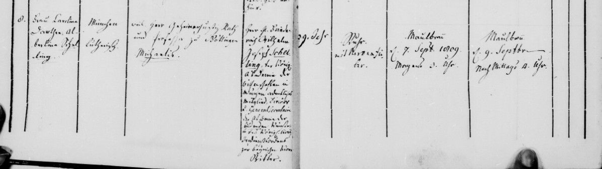 Schellings erste Frau verstarb im Jahr 1809 während eines Besuchs im Haus seiner Eltern in Maulbronn an der Ruhr. Ihr Tod ist im dortigen Sterberegister vermerkt. Schellings Vater war seit 1807 Prälat und Generalsuperintendent in Maulbronn. Der Philosoph selbst erscheint in keinem württembergischen Sterberegister. Er starb während eines Kuraufenthalts in Bad Ragaz in der Schweiz.