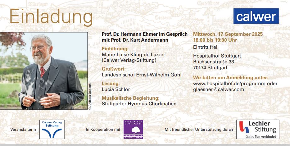 In seinem neuen Buch beschreibt der langjährige ehemalige Leiter des Landeskirchlichen Archivs Stuttgart, Hermann Ehmer, die Kirchengeschichte Württembergs von der Christianisierung bis zur Gegenwart. Wir sind sehr gespannt auf dieses Werk. Die Buchpremiere findet am 17. September um 18 Uhr im Hospitalhof in Stuttgart statt. Der Hospitalhof bittet um Anmeldung.