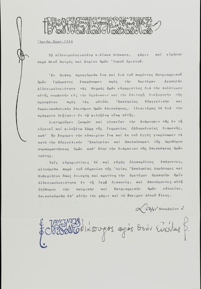 - Dankesbrief des Ökumenischen Patriarchen Bartholomäus. EABW, D 206, Nr. 4