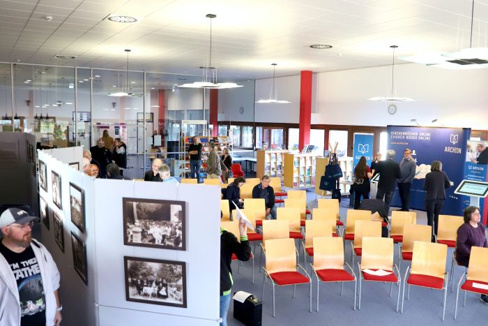 Der Lesesaal verwandelte sich in einen Marktplatz mit Ständen von Vereinen, Terminals des Kirchenbuchportals ARCHION und Ausstellung.