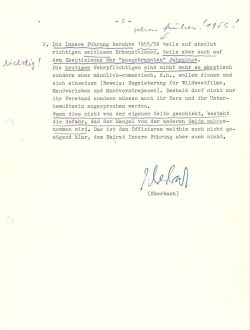 - Aktenvermerk von Heinrich Eberbach (aus der Ev. Akademie Bad Boll) mit Sichtvermerk von u.a. Franz Josef Strauß, Seite 1. EABW, K55, Nr. 27, Aktenvermerk im Verteidigungsministerium.