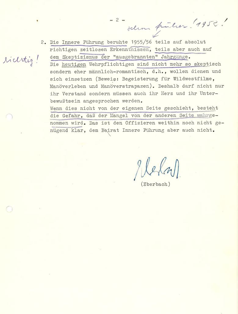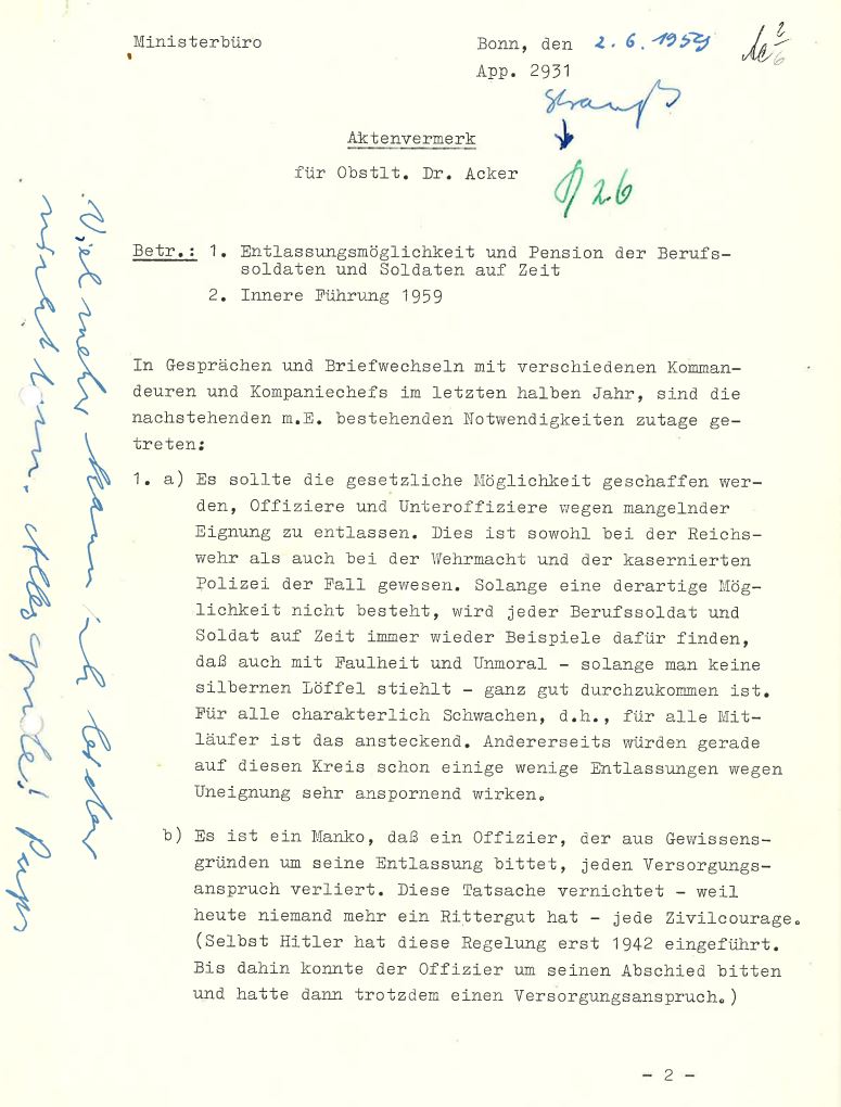 - Aktenvermerk von Heinrich Eberbach (aus der Ev. Akademie Bad Boll) mit Sichtvermerk von u.a. Franz Josef Strauß, Seite 1. EABW, K55, Nr. 27, Aktenvermerk im Verteidigungsministerium.