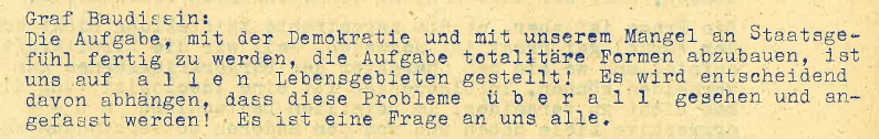 Häufig wurden dazu verschiedene Institutionen und Gruppen zusammengebracht. So gab es beispielsweise Tagungen, bei denen Soldaten mit Gewerkschaftern, der Presse oder Hochschulen in den Dialog traten. Auf der politischen Ebene lag der Schwerpunkt auf der Erziehung des Soldaten zum demokratischen Staatsbürger. So äußerte sich der Offizier und Militärtheoretiker Wolf Graf von Baudissin bei einem Podiumsgespräch in Bad Boll Anfang 1955 zur demokratischen Verantwortung aller Deutschen: