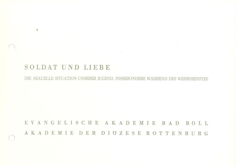 Daneben sollte den Soldaten im Rahmen einer Rüstzeit die Möglichkeit einer geistlichen Auszeit geboten werden. Gelegentlich wurden auch familiäre Angelegenheiten zum Tagungsthema gemacht. So wurde beispielsweise 1960 eine Veranstaltung mit dem schönen Titel „Soldat und die Liebe” (siehe K55/29) organisiert.
